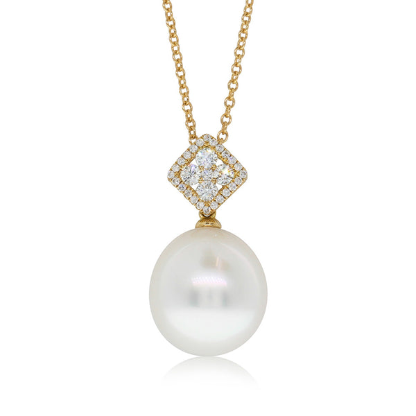Dazzle her with this shining South Sea pearl and diamond pendant. This elegant pendant has been crafted in 18ct yellow gold and features a glimmering white pearl and round brilliant cut diamonds.