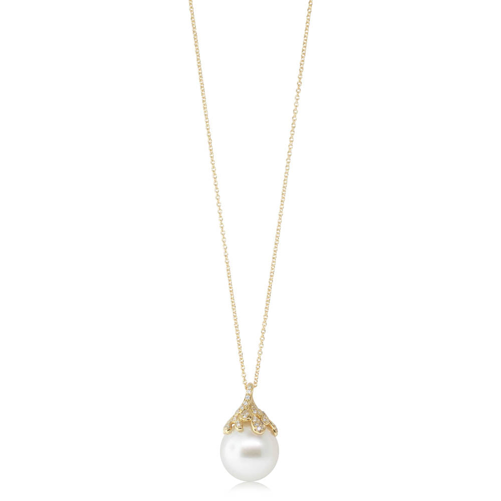 Sparkle from each and every angle in this glistening pearl & diamond pendant! Crafted from beautiful 18ct yellow gold, this mesmerising pendant features a decorative diamond set mount holding a beautiful oval South Sea pearl. A real treasure that will receive so many compliments!