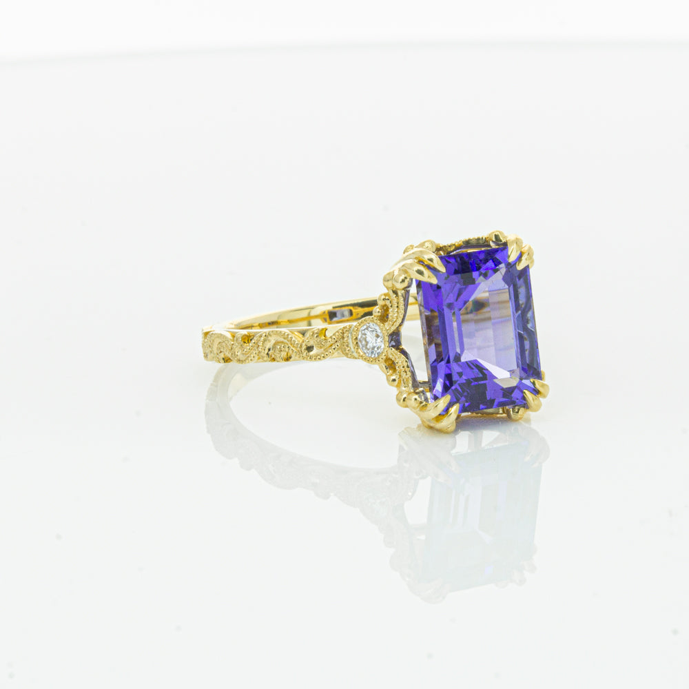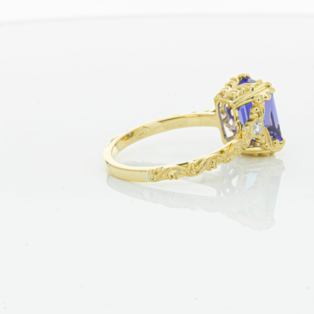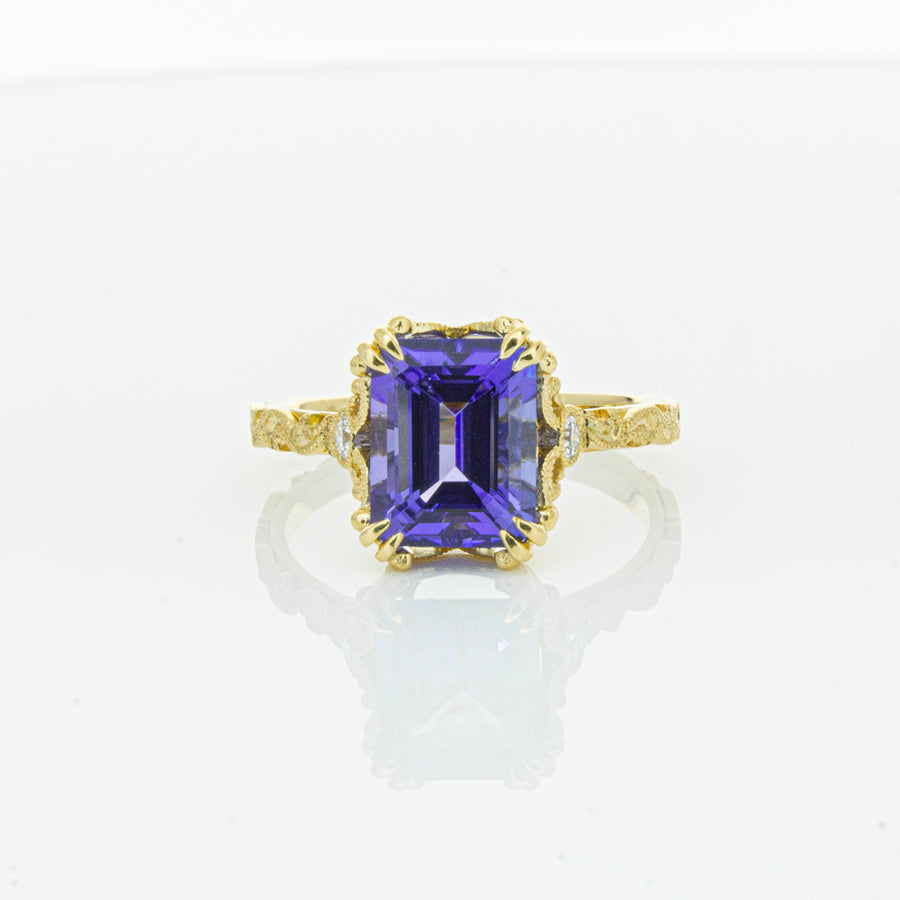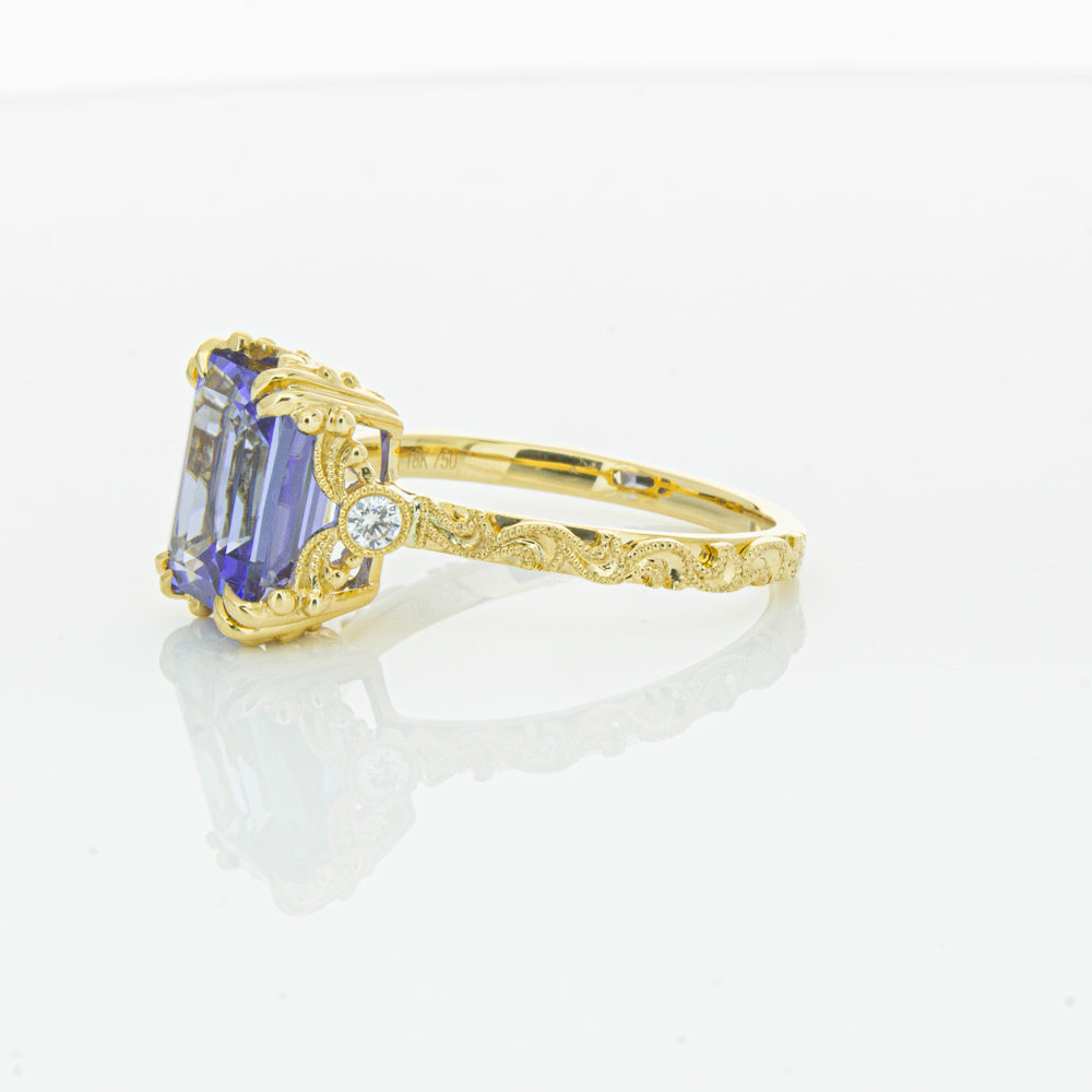 Set in 18ct yellow gold, this Romanov ring features one rectangular step cut tanzanite secured by a double four claw setting with delicate detailed shoulders featuring two round brilliant cut diamonds.