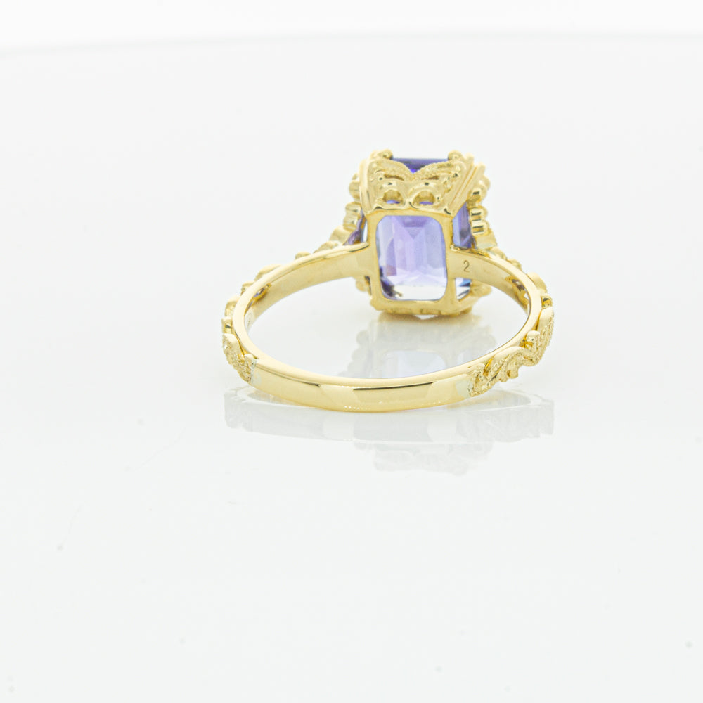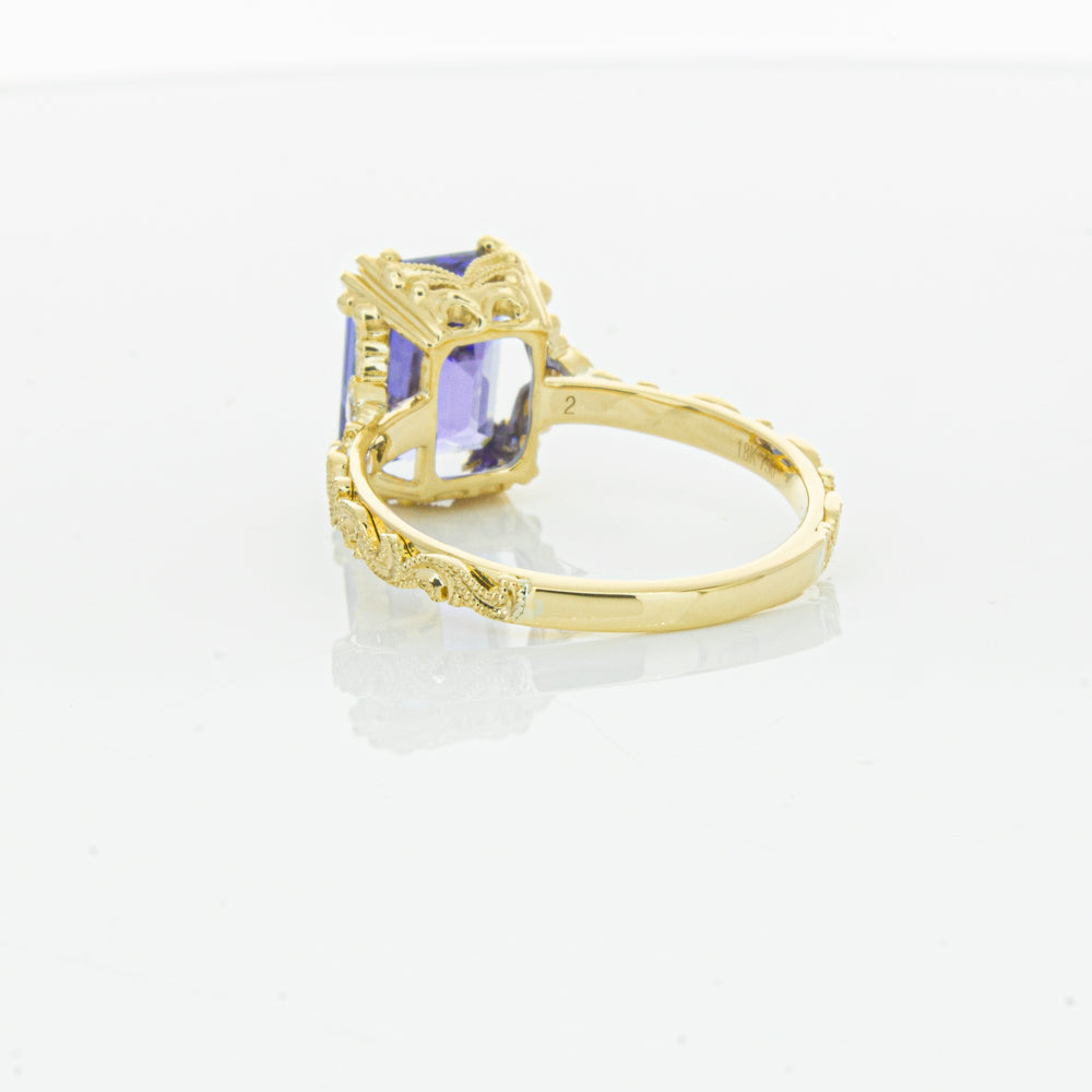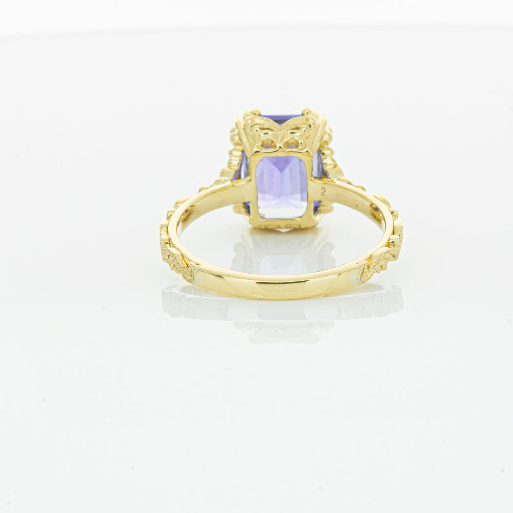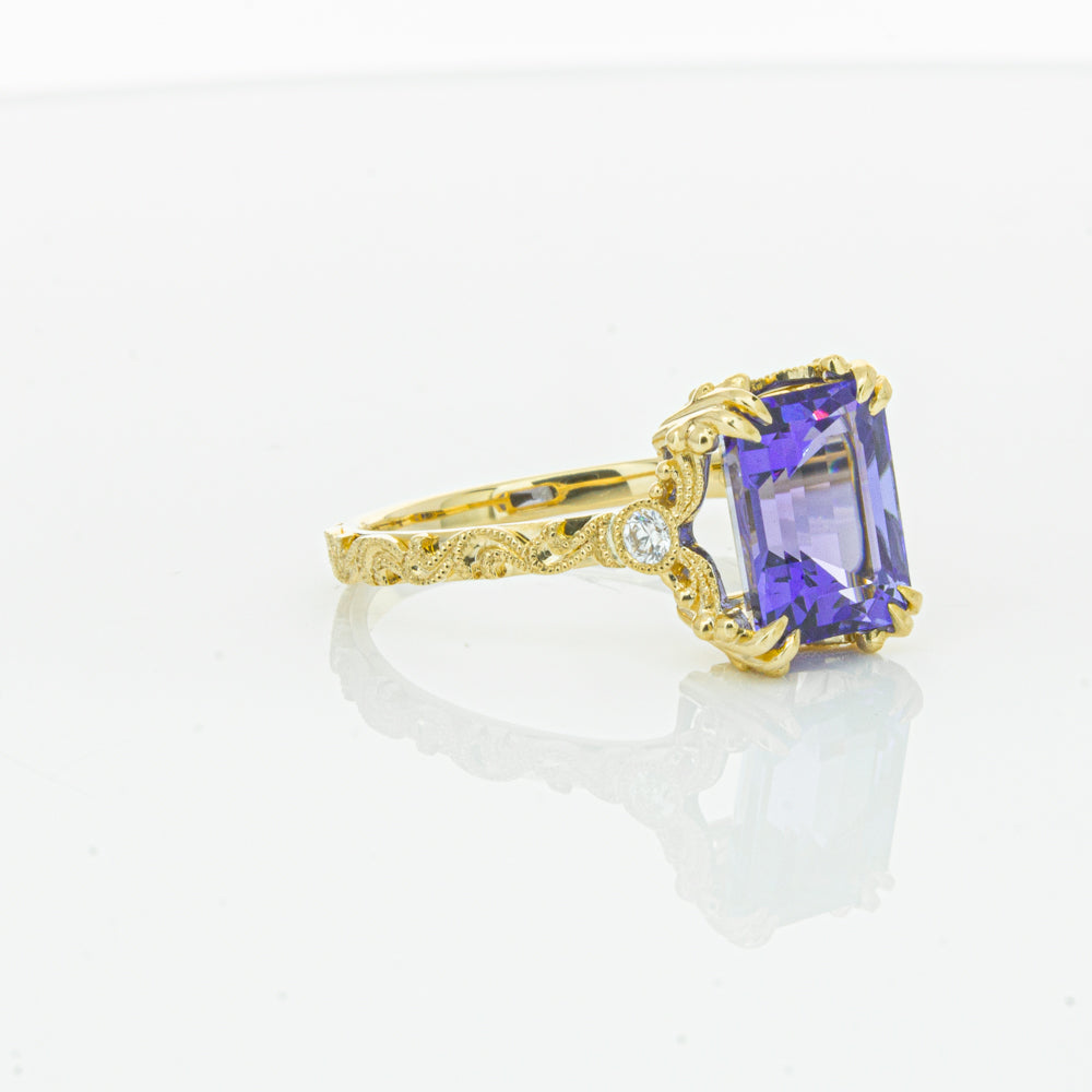 Set in 18ct yellow gold, this Romanov ring features one rectangular step cut tanzanite secured by a double four claw setting with delicate detailed shoulders featuring two round brilliant cut diamonds.