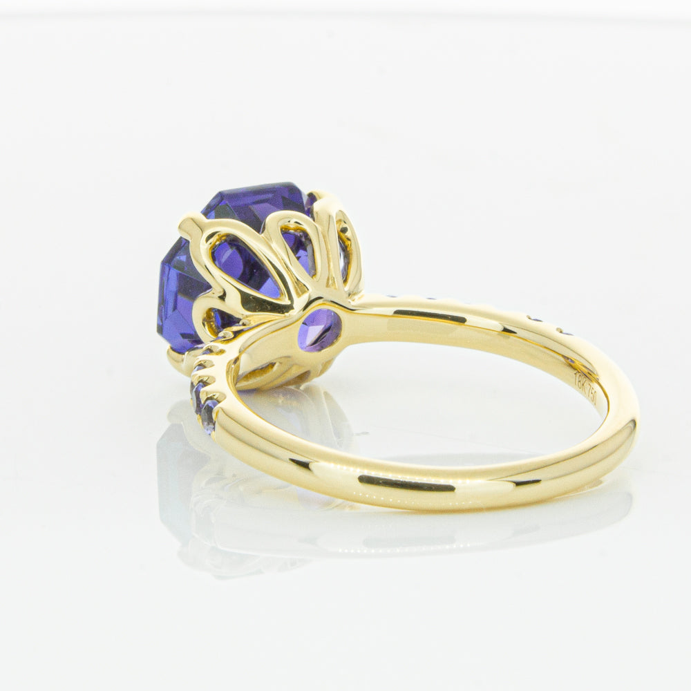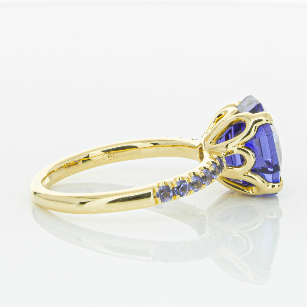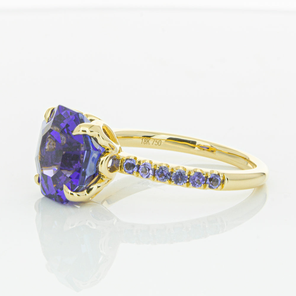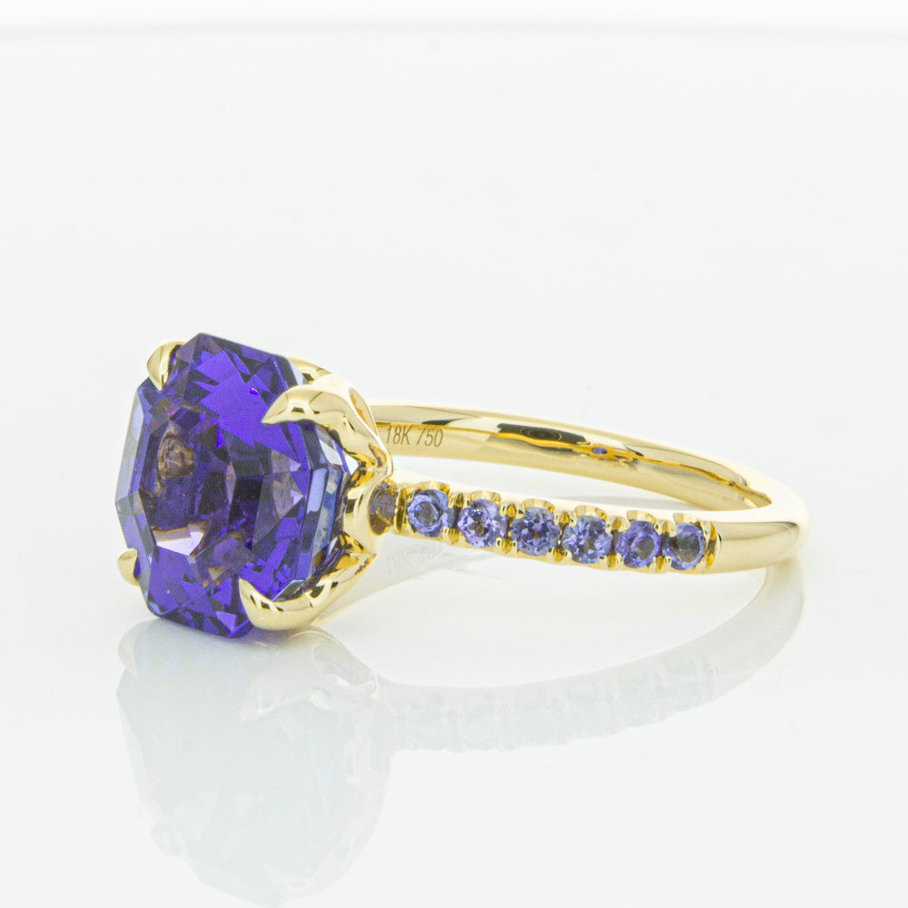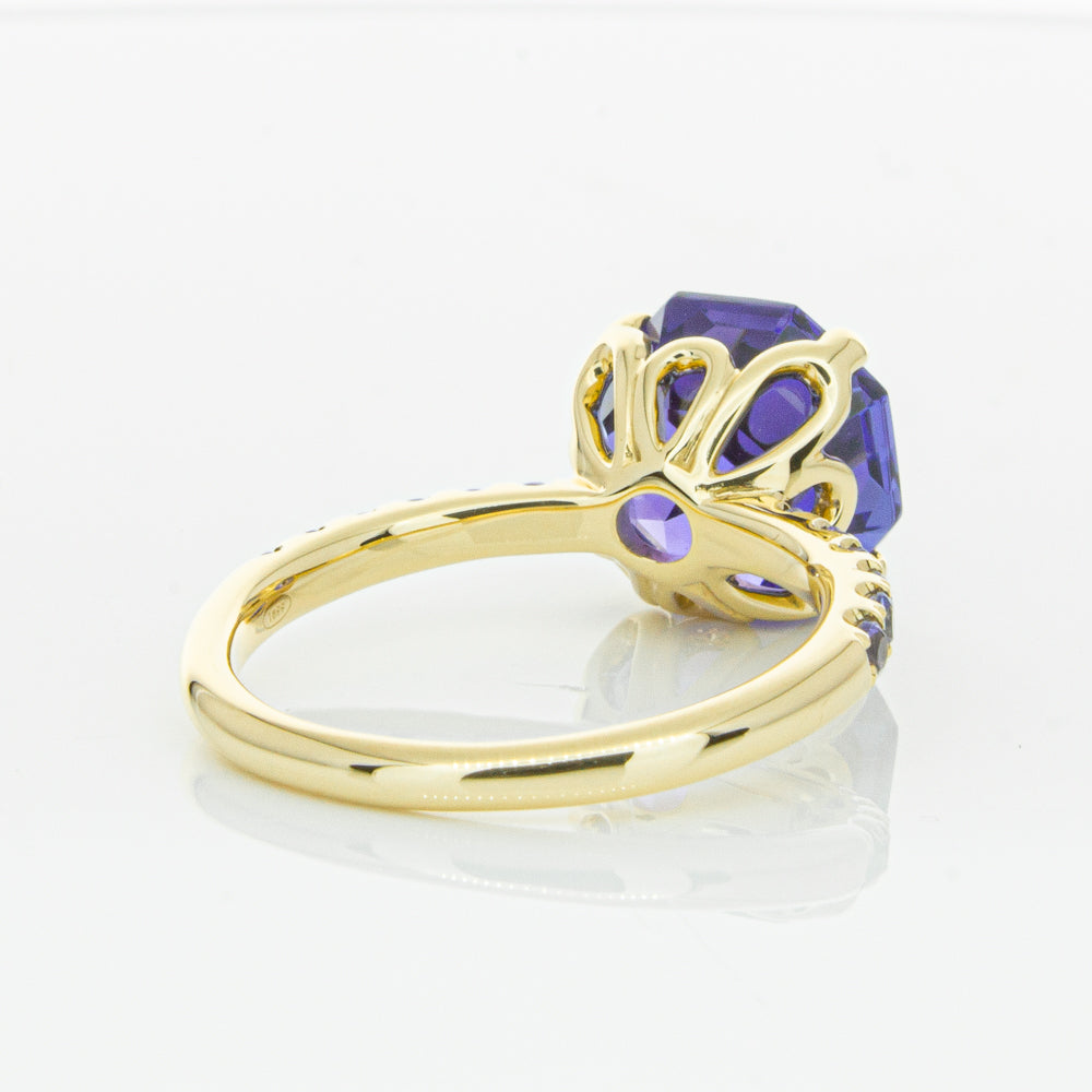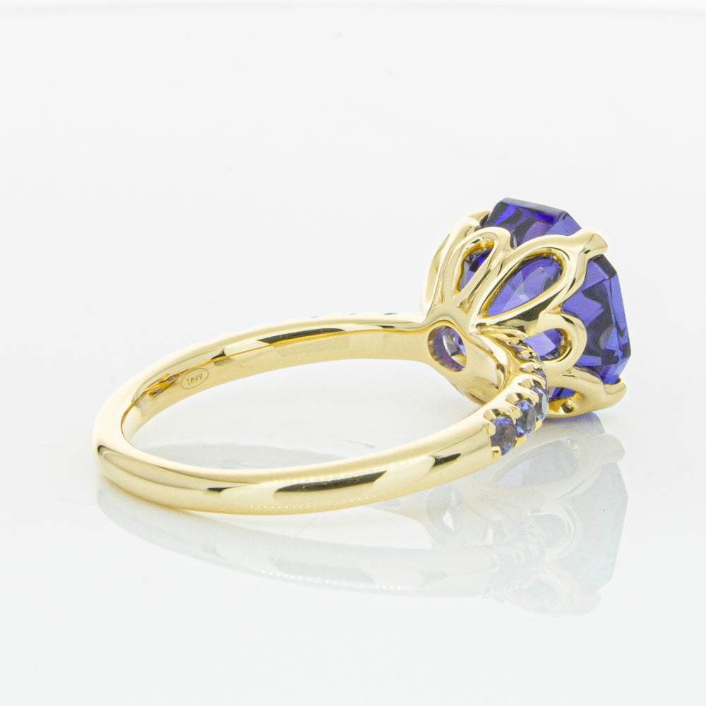 A stunning addition to our Octavia collection, this glistening 1899 Octavus ring boasts one impressive octagonal faceted tanzanite in a 18ct yellow gold with smaller tanzanite set shoulders. Strikingly unique, you will adore showing off this mesmerising ring!
