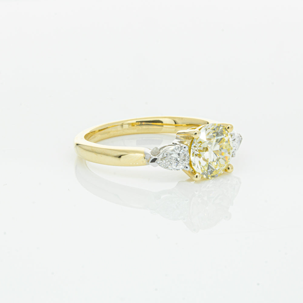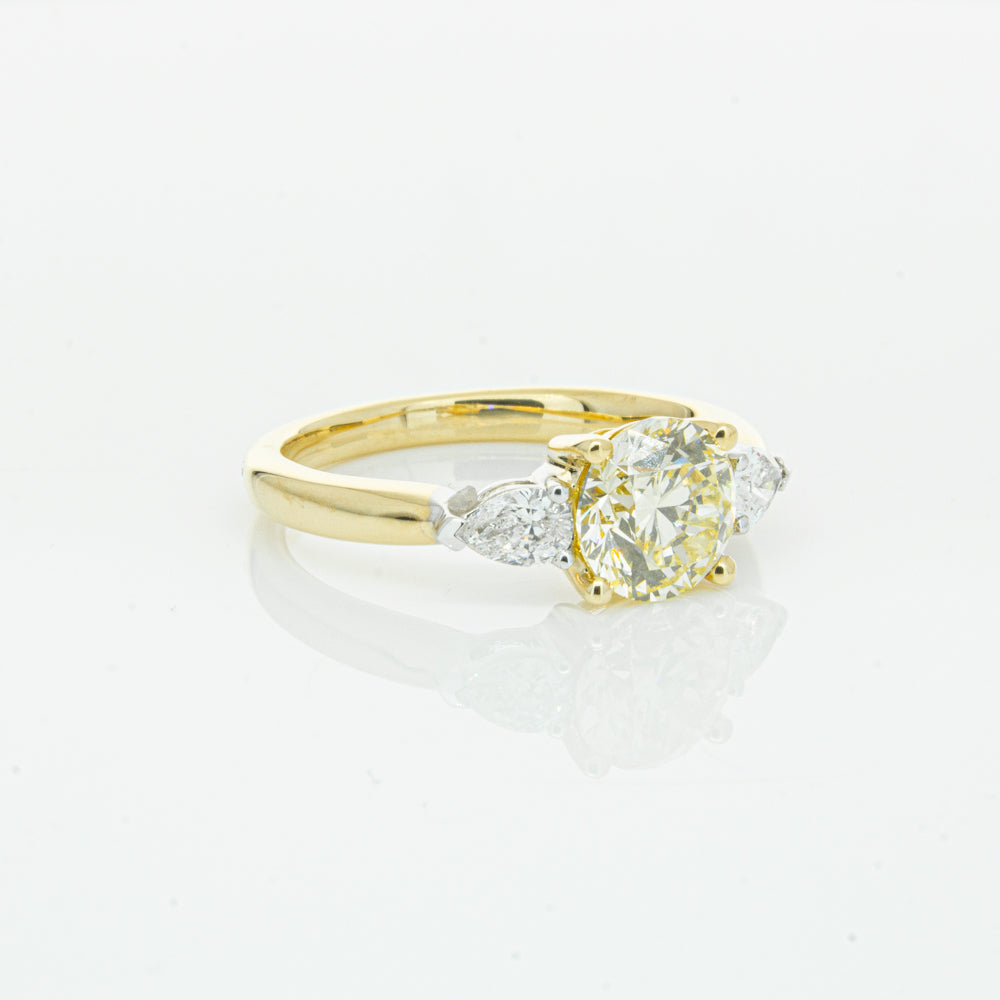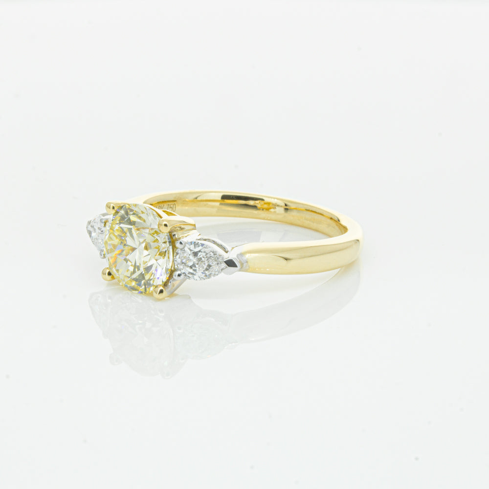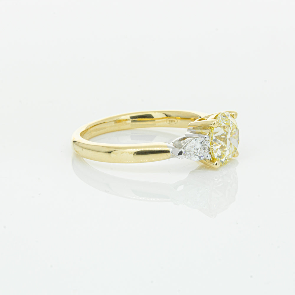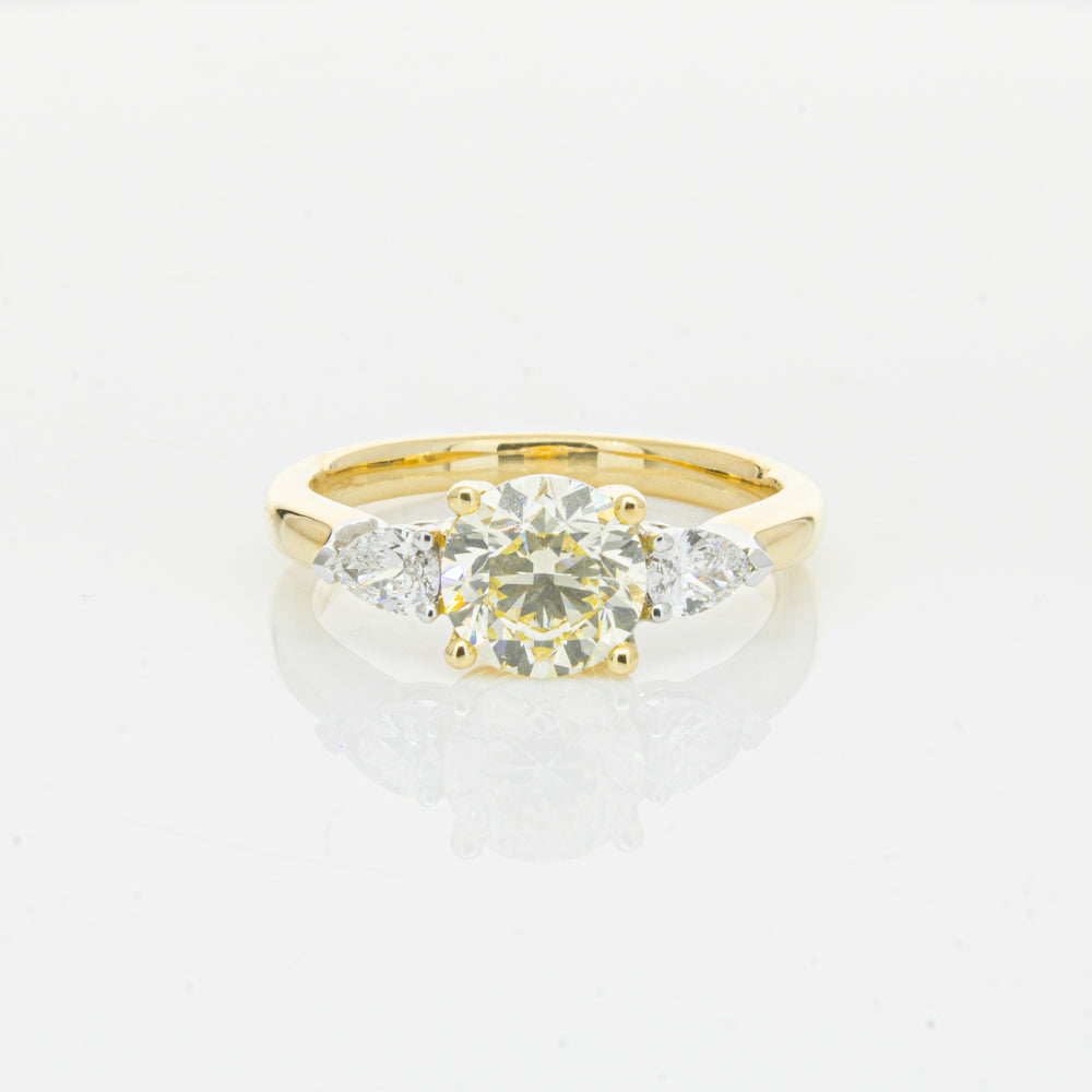 "Elegance is the only beauty that never fades!" Boasting a stunning round brilliant cut yellow diamond and two pear brilliant cut diamonds you will be the definition of beauty and elegance in this Ayla ring from our signature 1899 collection, beautifully set in 18ct yellow and white gold.