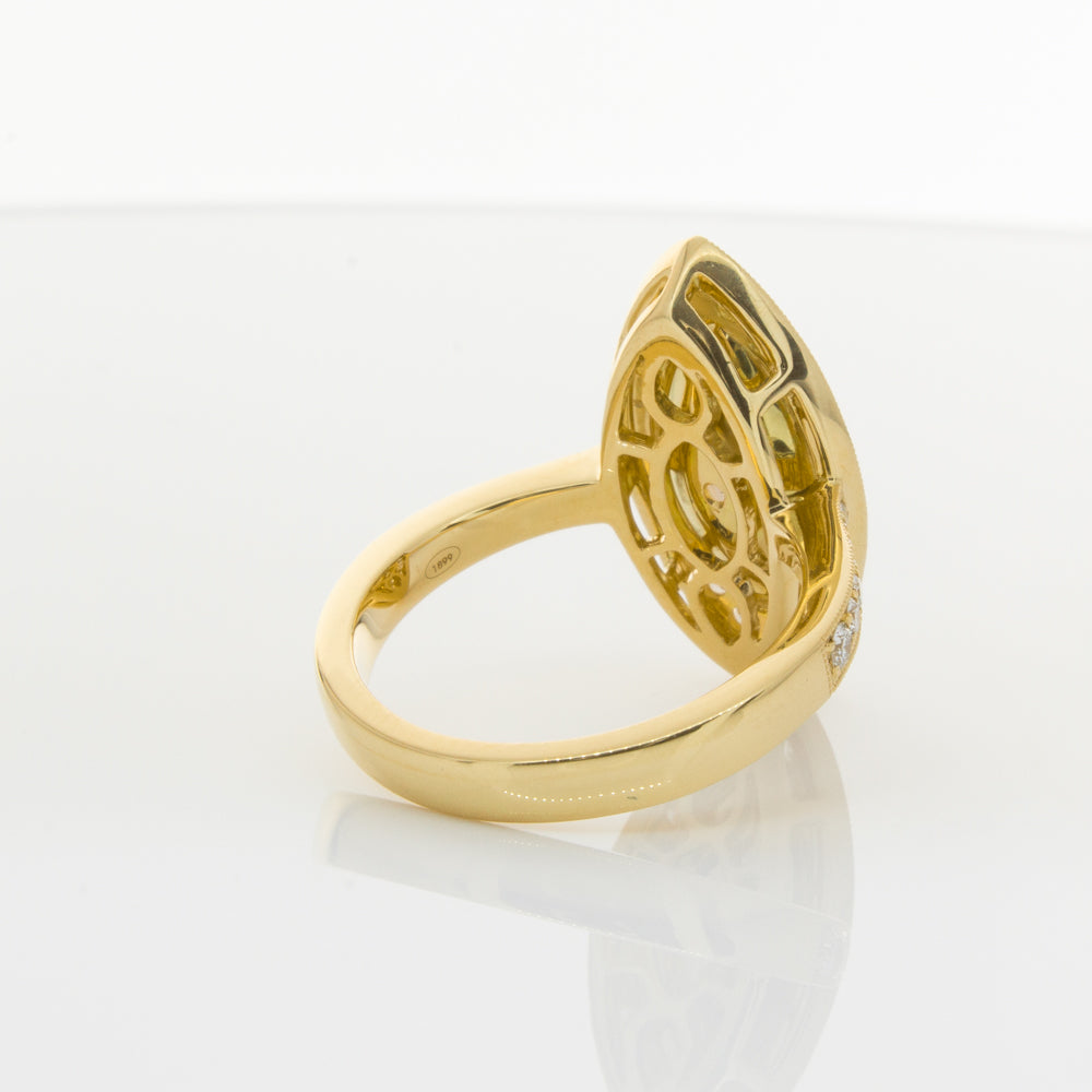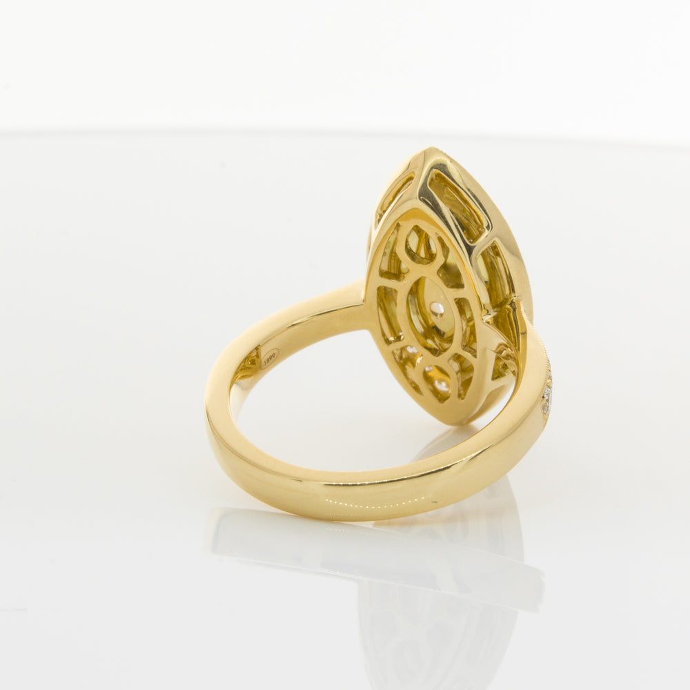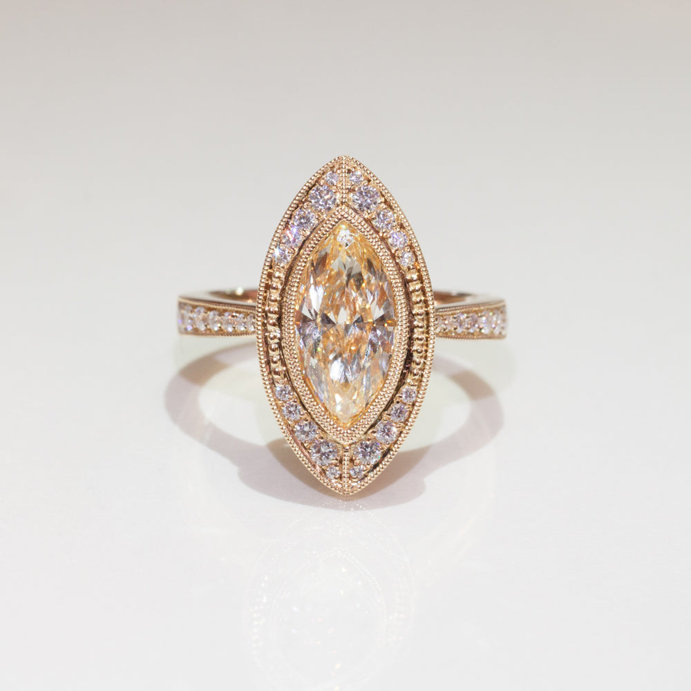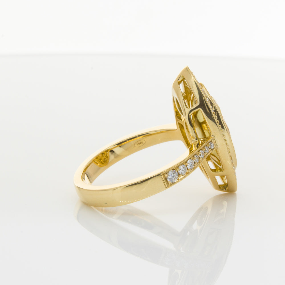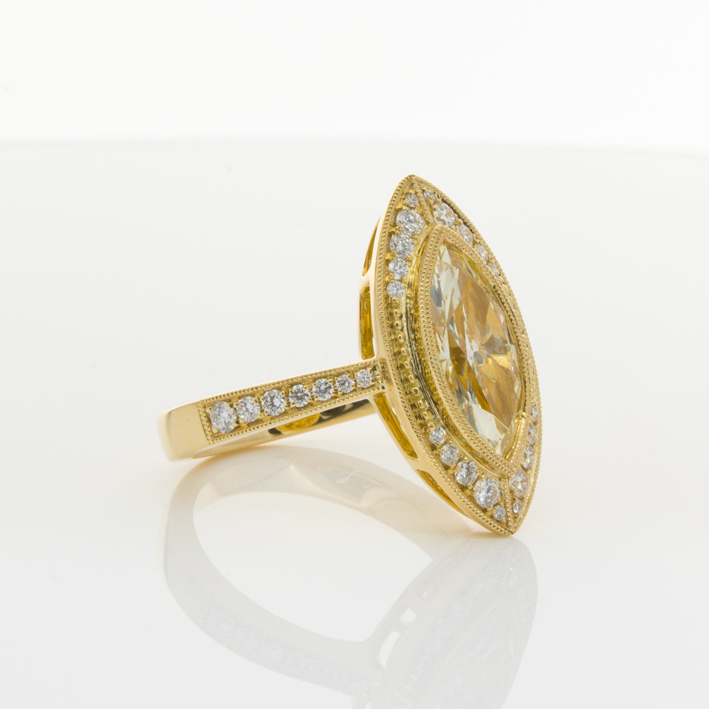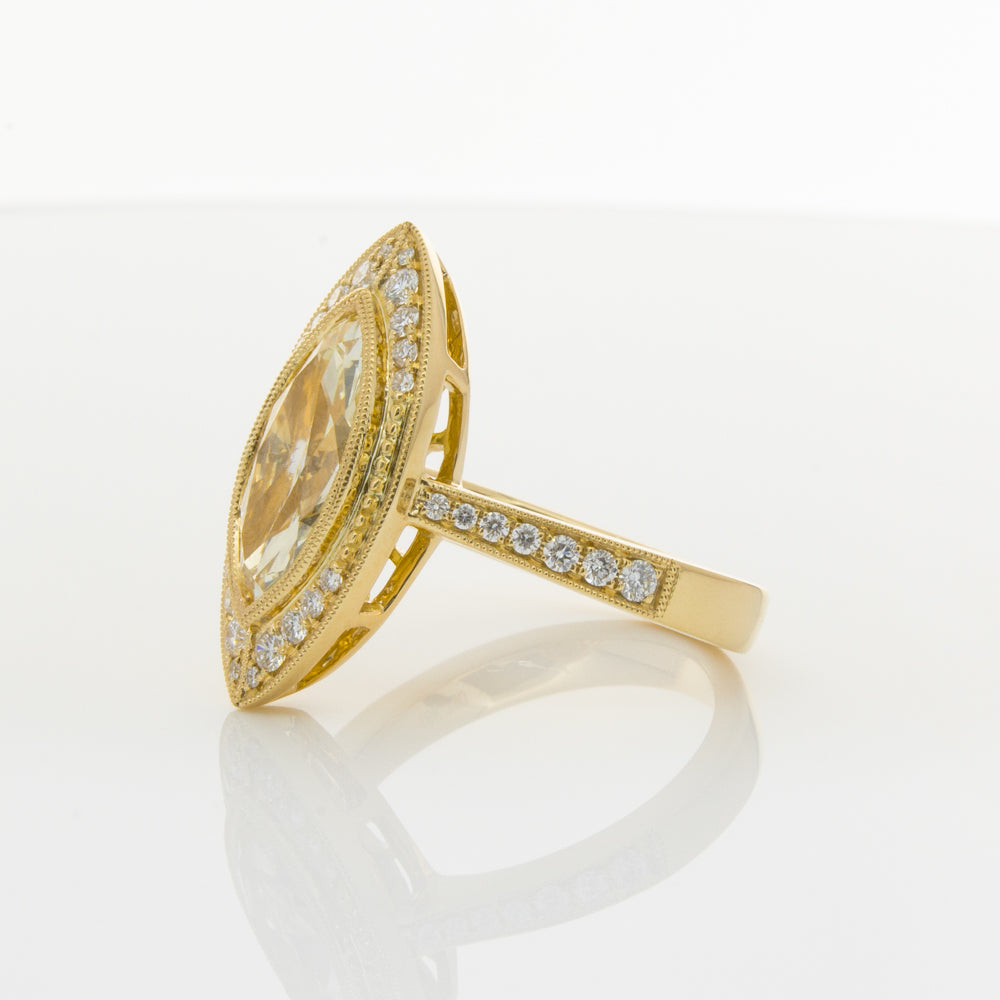 Carefully crafted in 18ct yellow gold, this stunning ring boasts one marquise cut yellow diamond framed by dazzling white diamonds, resting on diamond set shoulders.