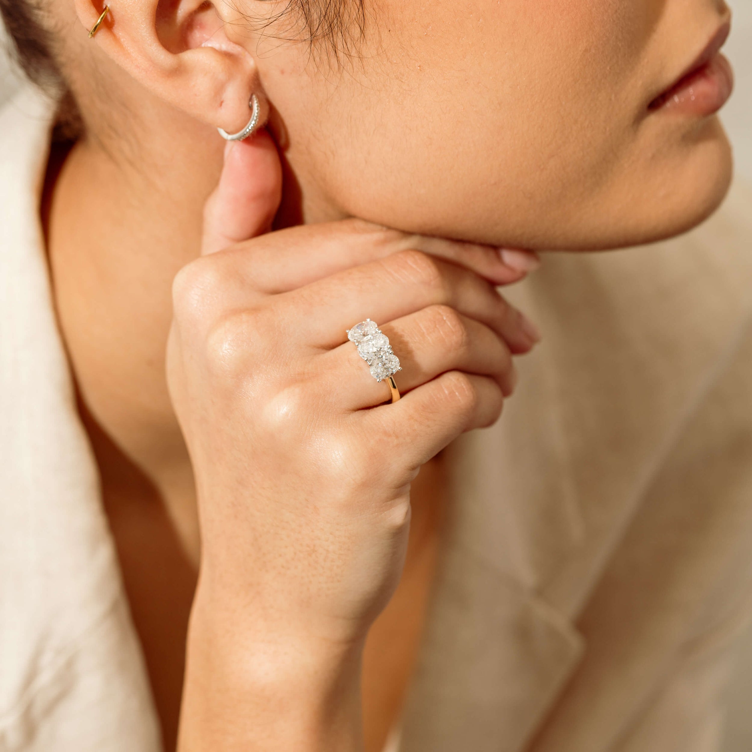 Model wearing natural diamond and gemstone rings, earrings and bracelet from the Curated Collection