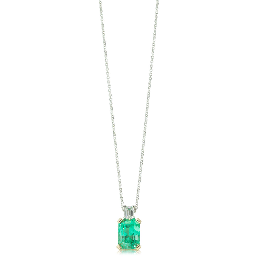 Light up the room with this glistening emerald & diamond pendant! This vibrant treasure boasts one emerald cut emerald resting in a luxurious 18ct yellow gold claw setting. A shimmering emerald cut diamond set bail adds extra sparkle to this elegant piece.