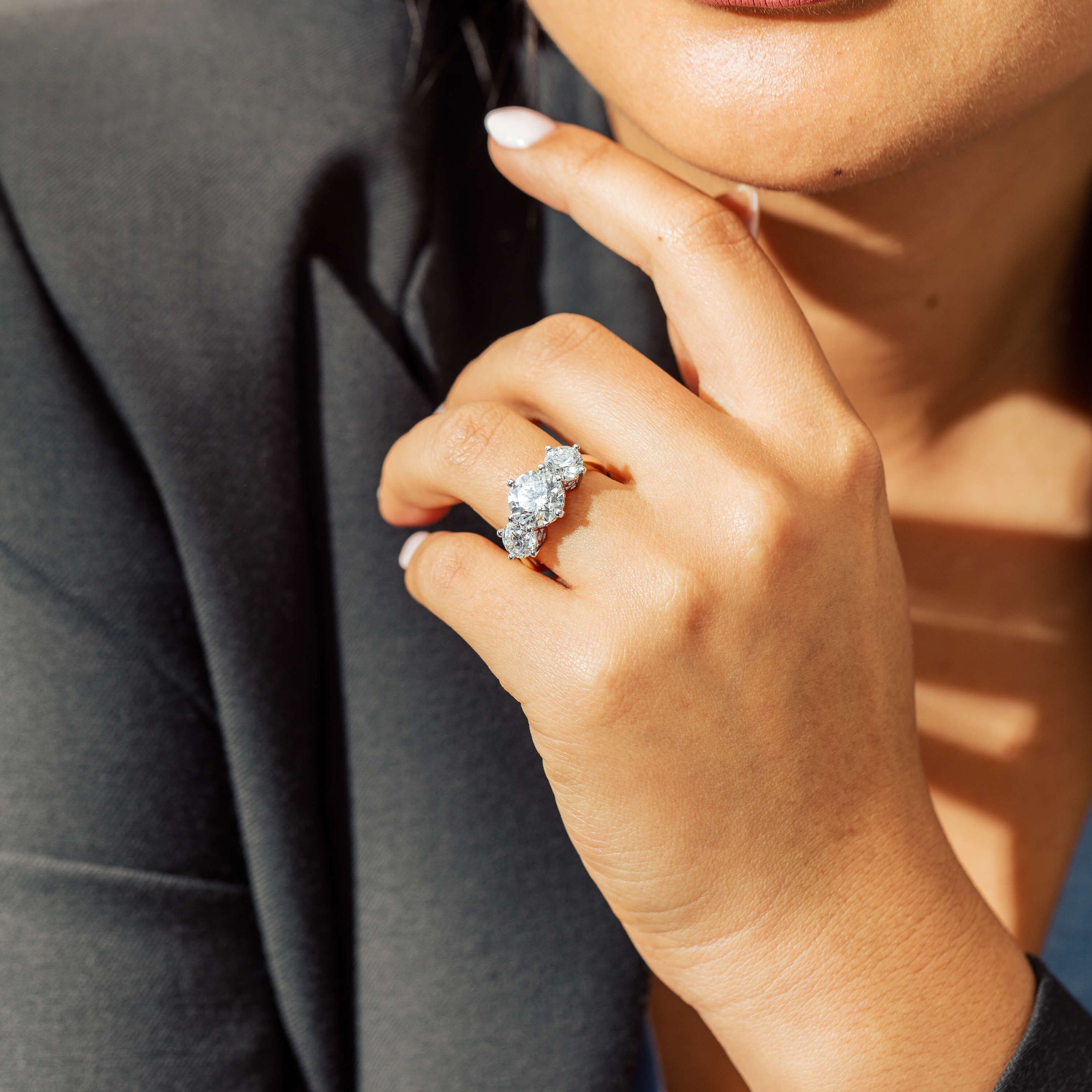 Model wearing natural diamond and gemstone rings, earrings and bracelet from the Curated Collection