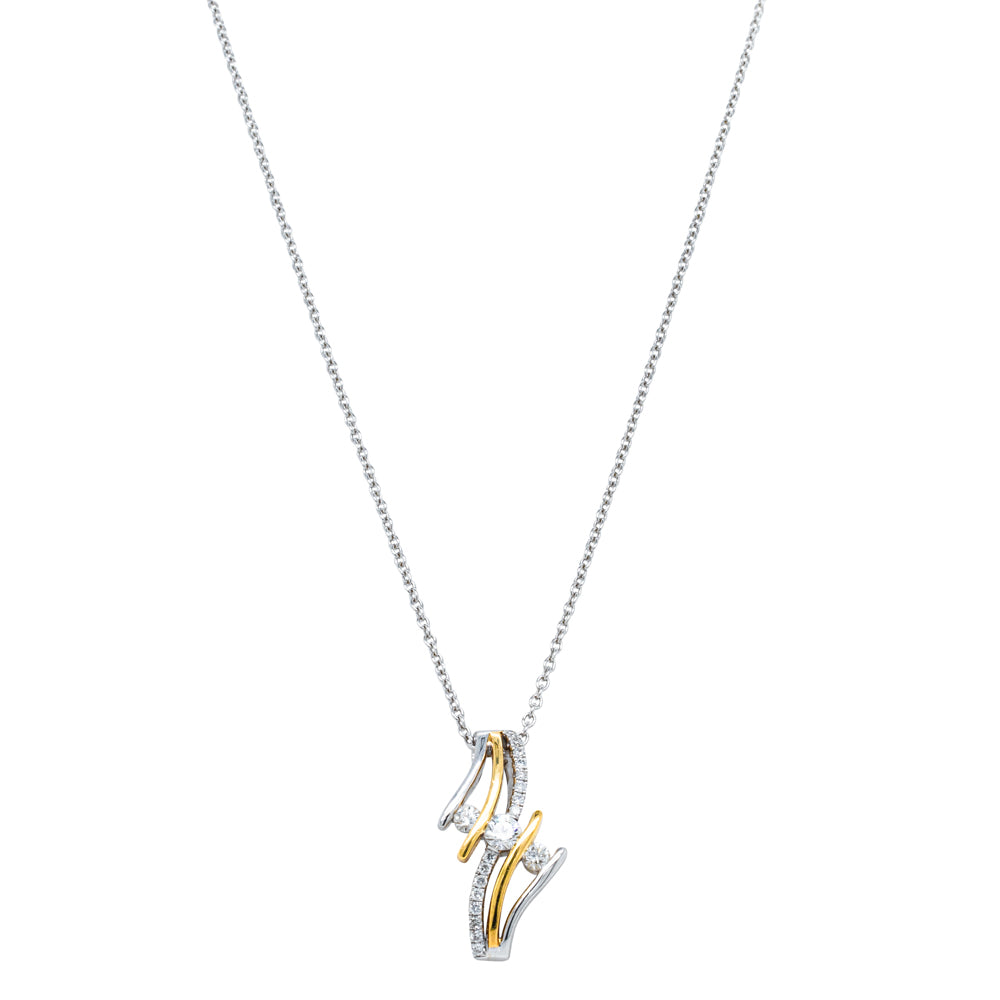This 18ct Yellow & White Gold Diamond Pendant radiates with elegance. Its unique design features sparkling diamonds set in two-tone gold for a look that will turn heads. Perfect for any special occasion.