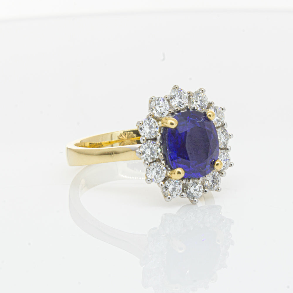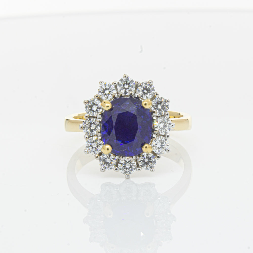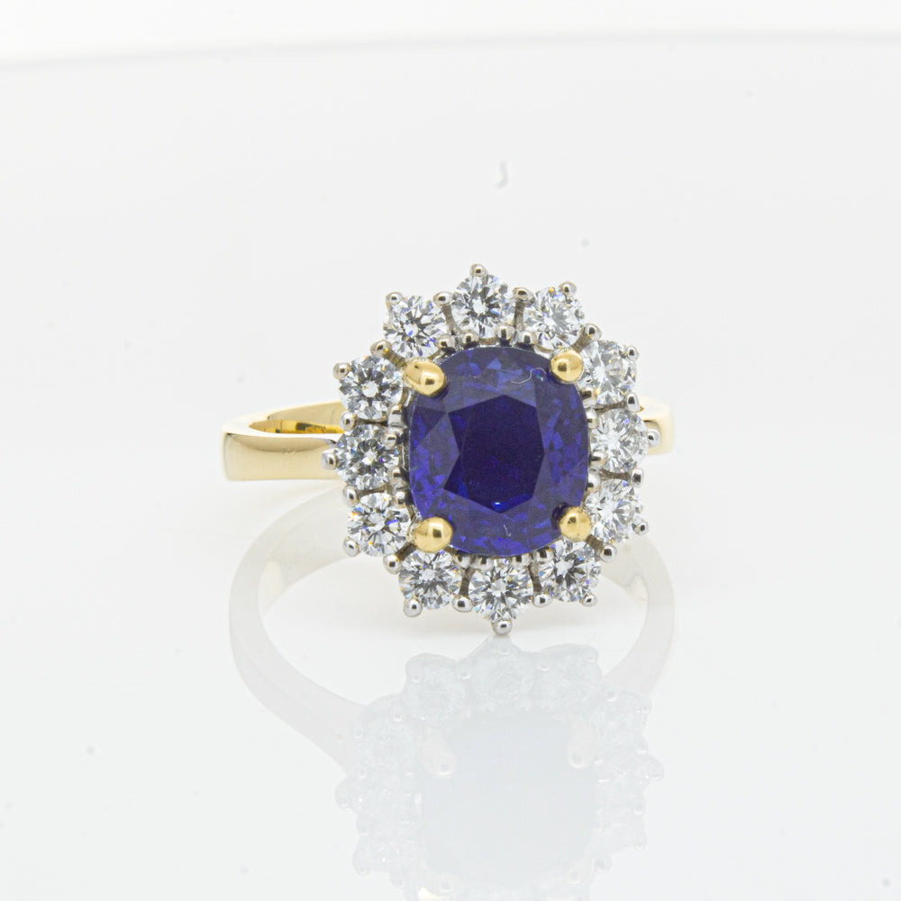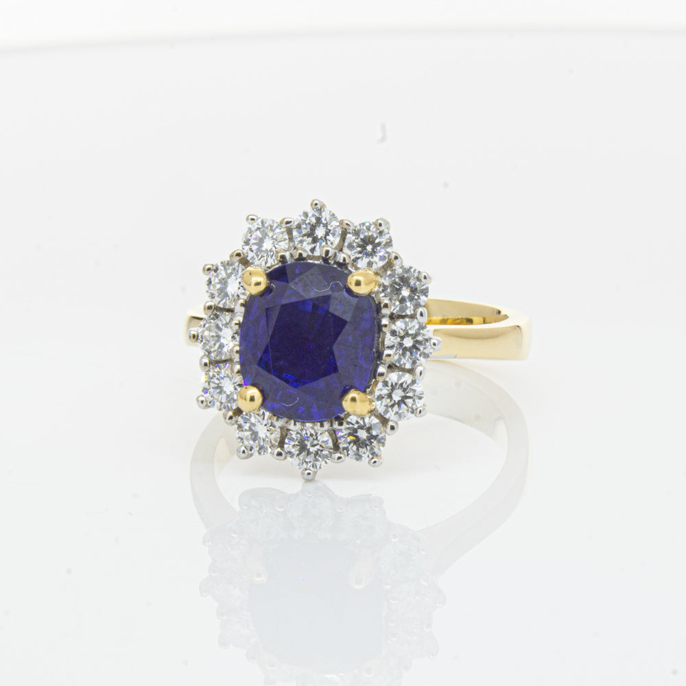 This spectacular ring has been carefully crafted in 18ct yellow and white gold and it boasts a strong blue sapphire framed by a sparkling diamond halo. You will always treasure this beautiful ring.