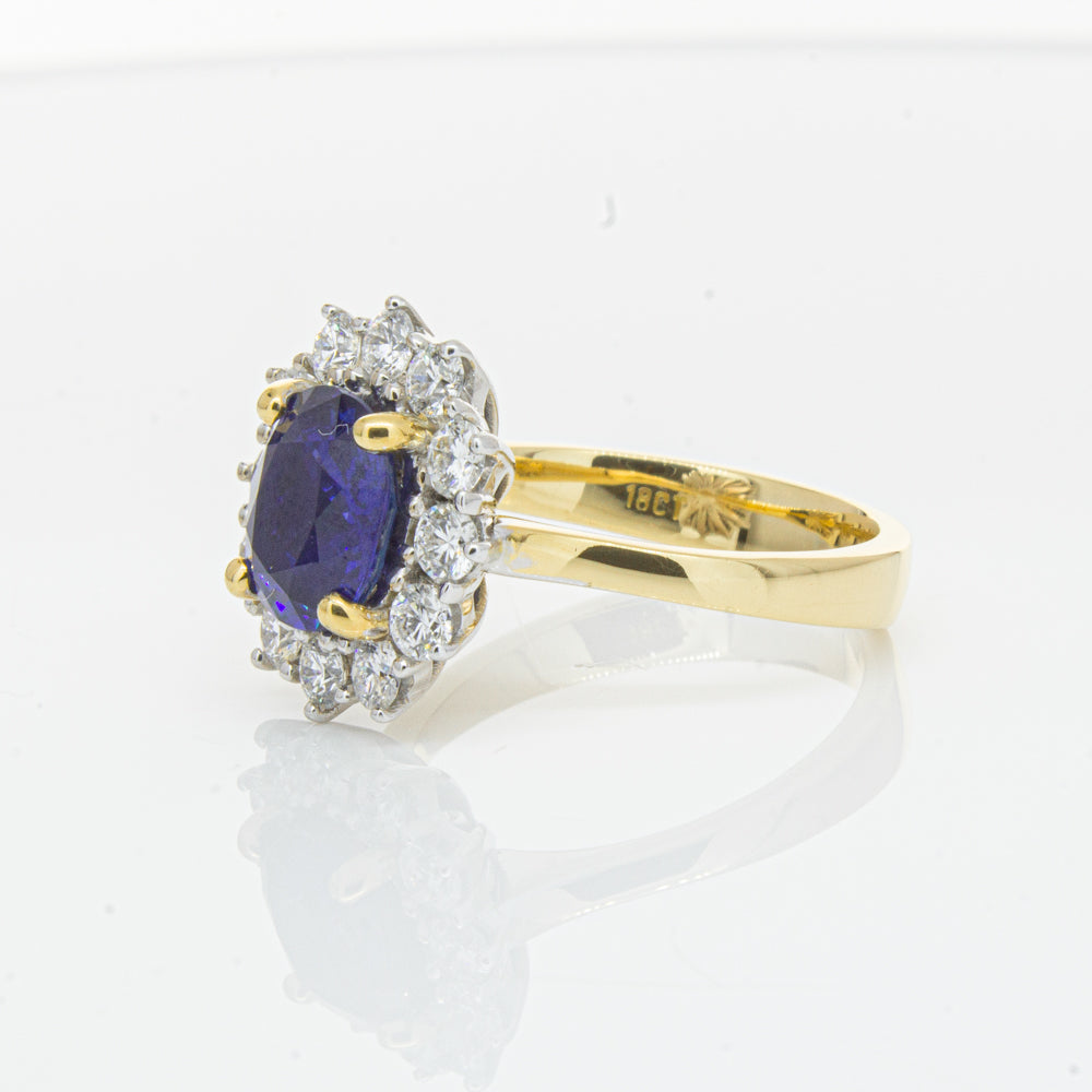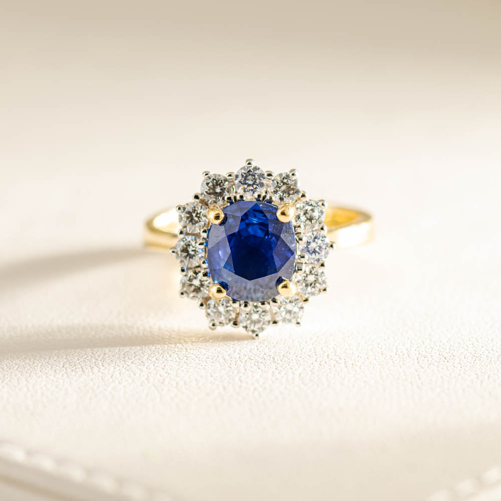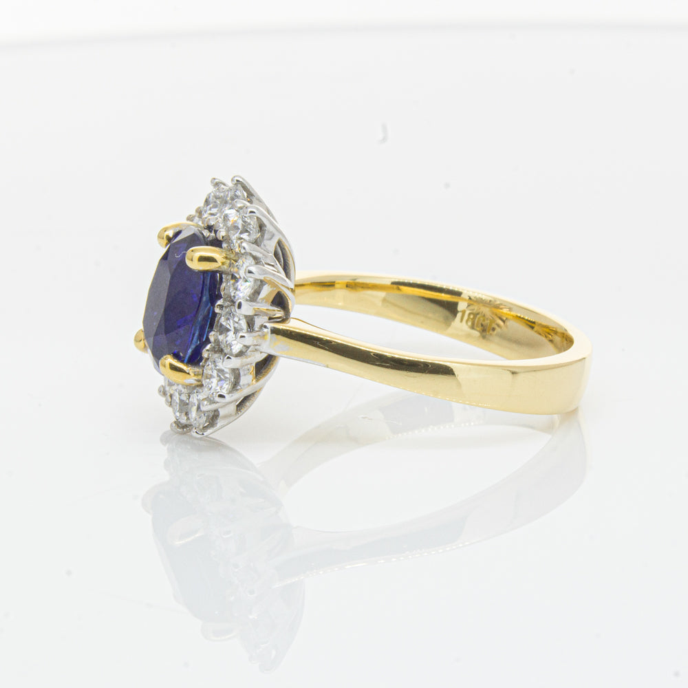 18ct Yellow Gold Oval Sapphire & Diamond Claw Set Halo Ring