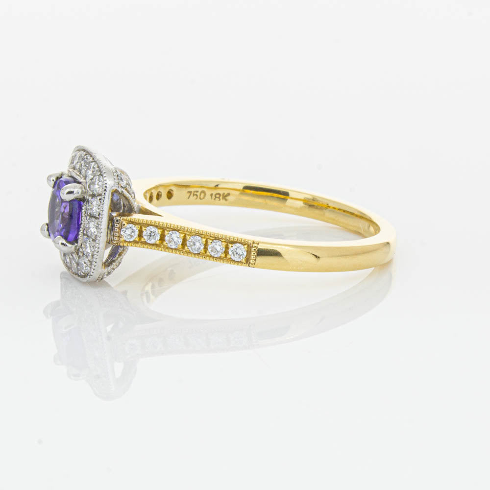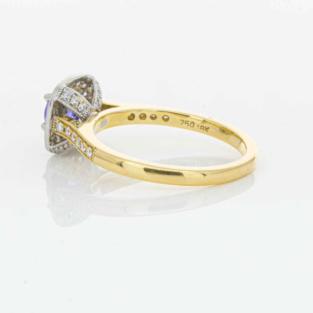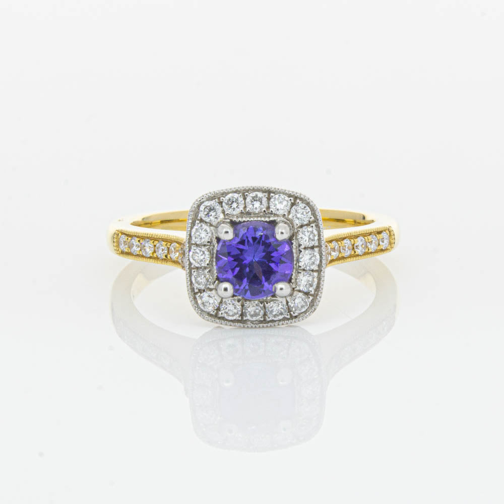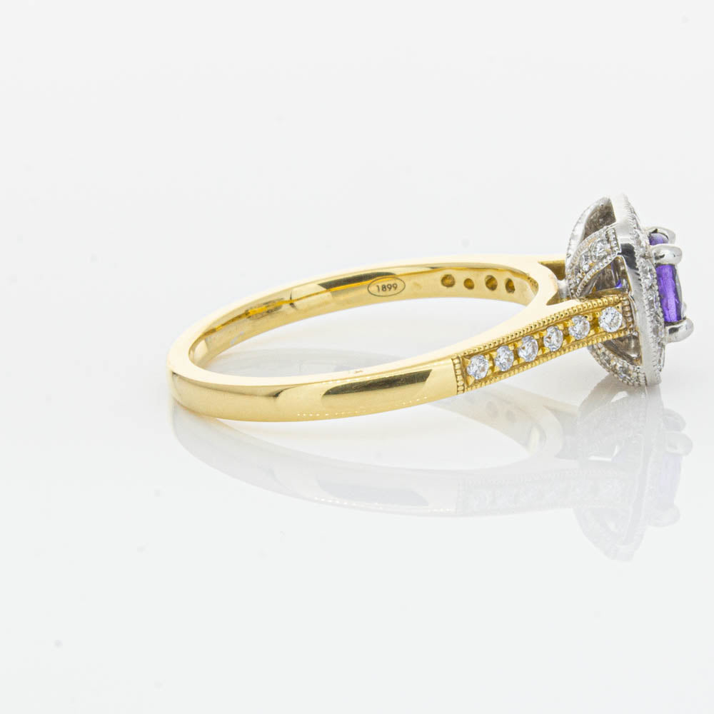 Surprise her with sparkles! This glistening ring boasts one round faceted tanzanite, framed by a glittering diamond halo. Further diamonds are set along the 18ct yellow gold band. She will adore it forever.