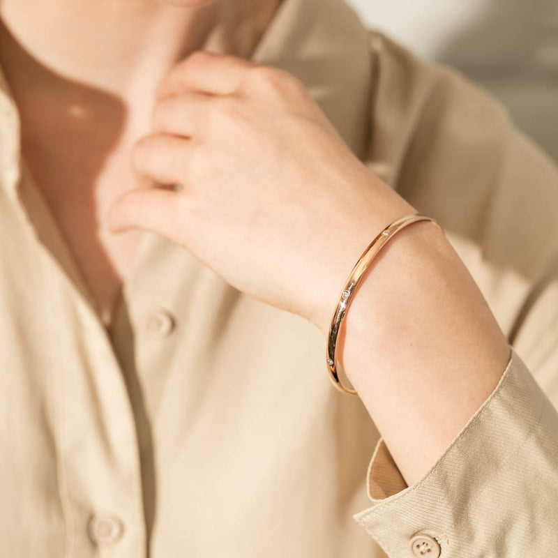 View Bag9ct rose gold bangle boasts eight shimmering round brilliant cut diamonds.