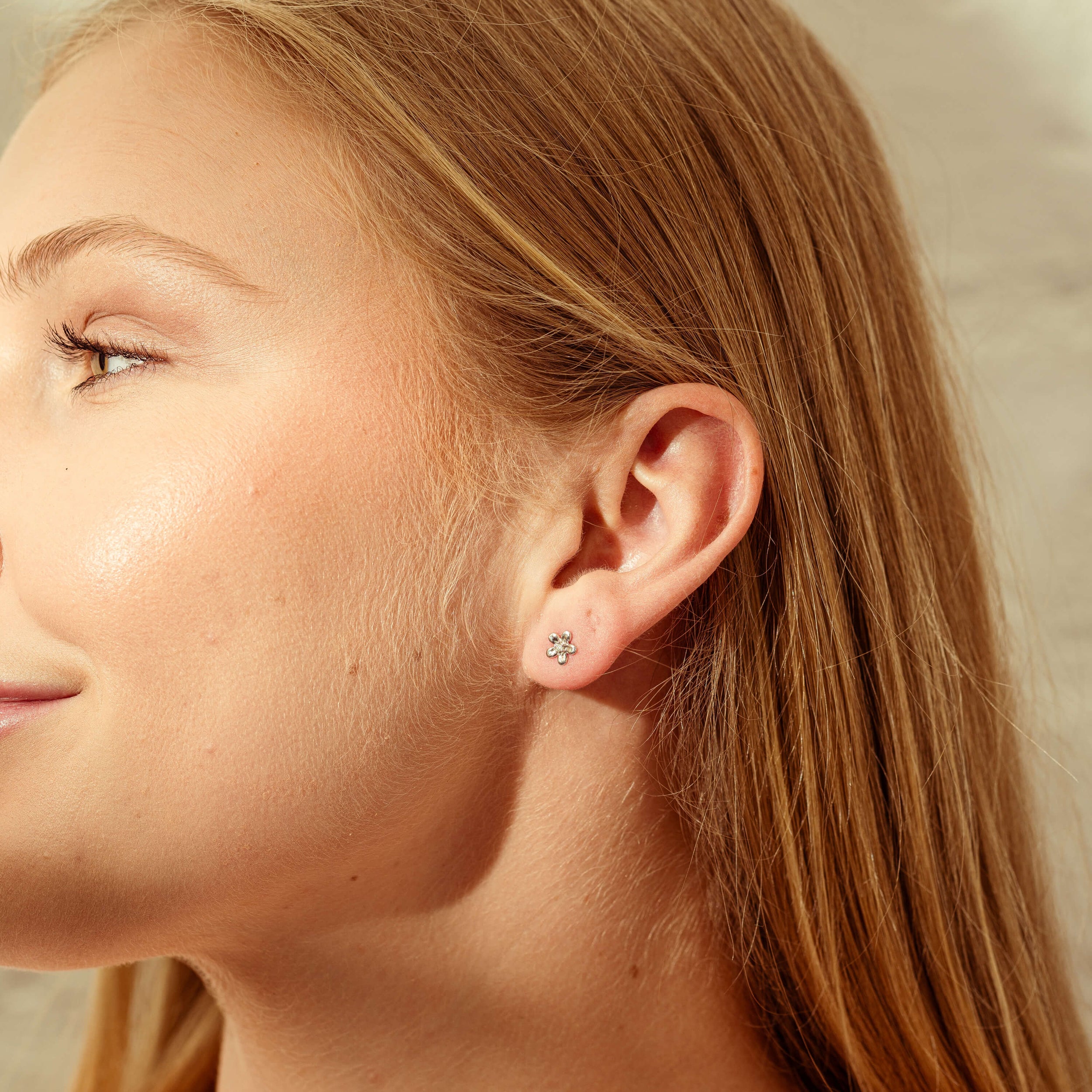 Carefully crafted in 9ct white gold, these sweet flower stud earrings feature two dazzling round brilliant cut centre diamonds.
