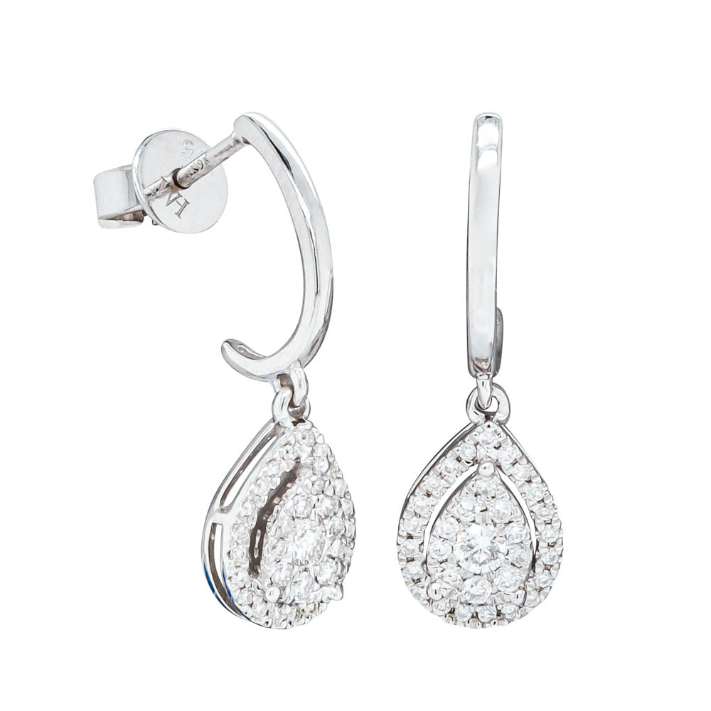Elevate your everyday with the subtle sparkle of these gorgeous pear saturn diamond drop earrings featuring a cluster of round brilliant cut diamonds that capture the light from every angle. Set in 9ct white gold.