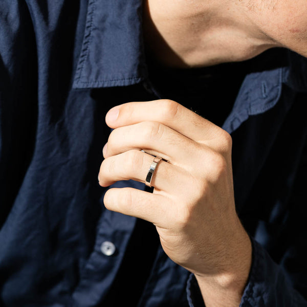 This 9ct white gold ring is 4mm wide and has a square profile edge. It is available in a standard polish finish as pictured or in a brushed finish.