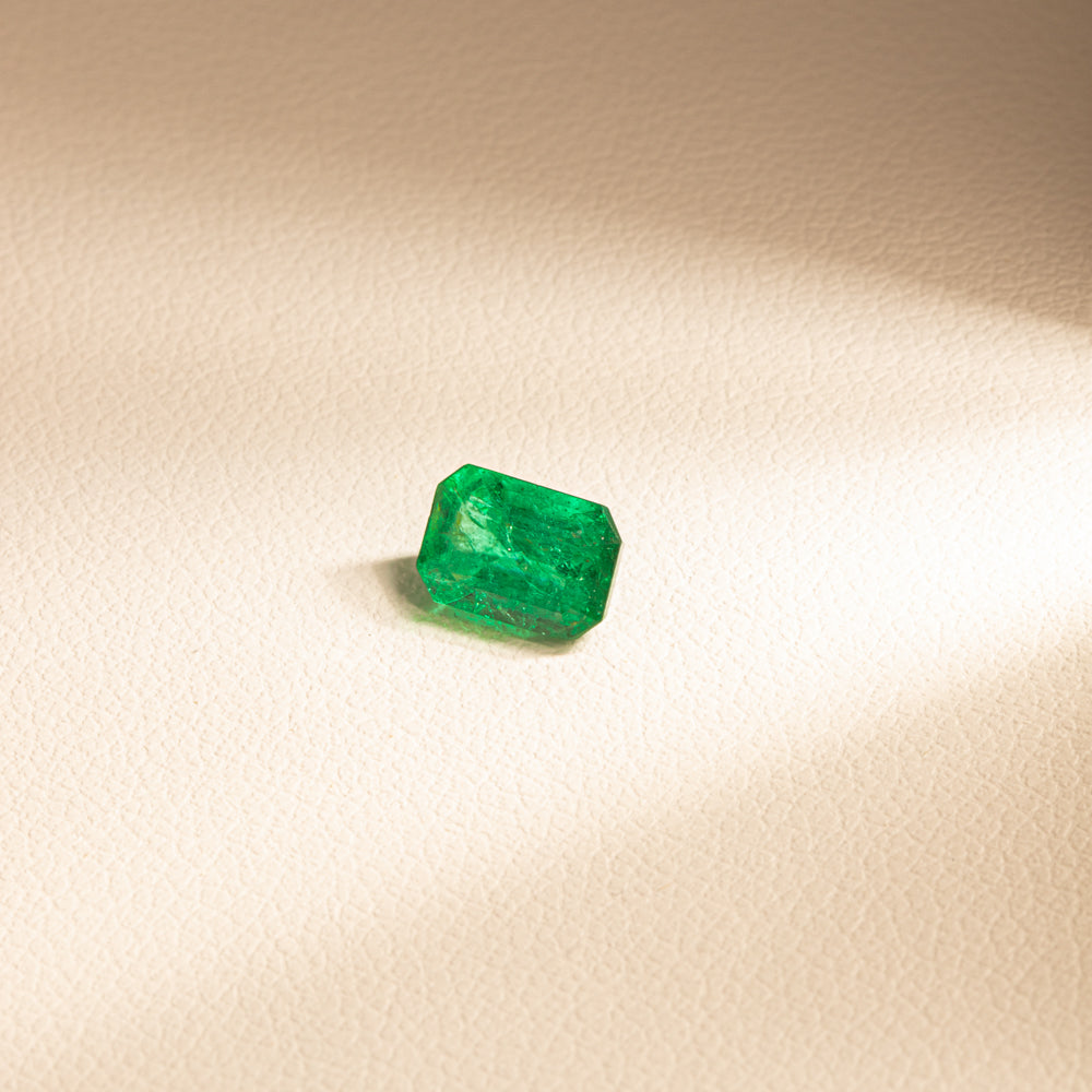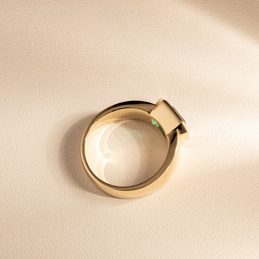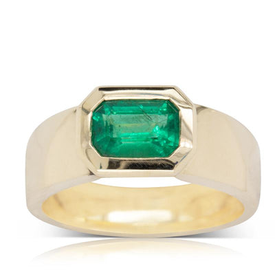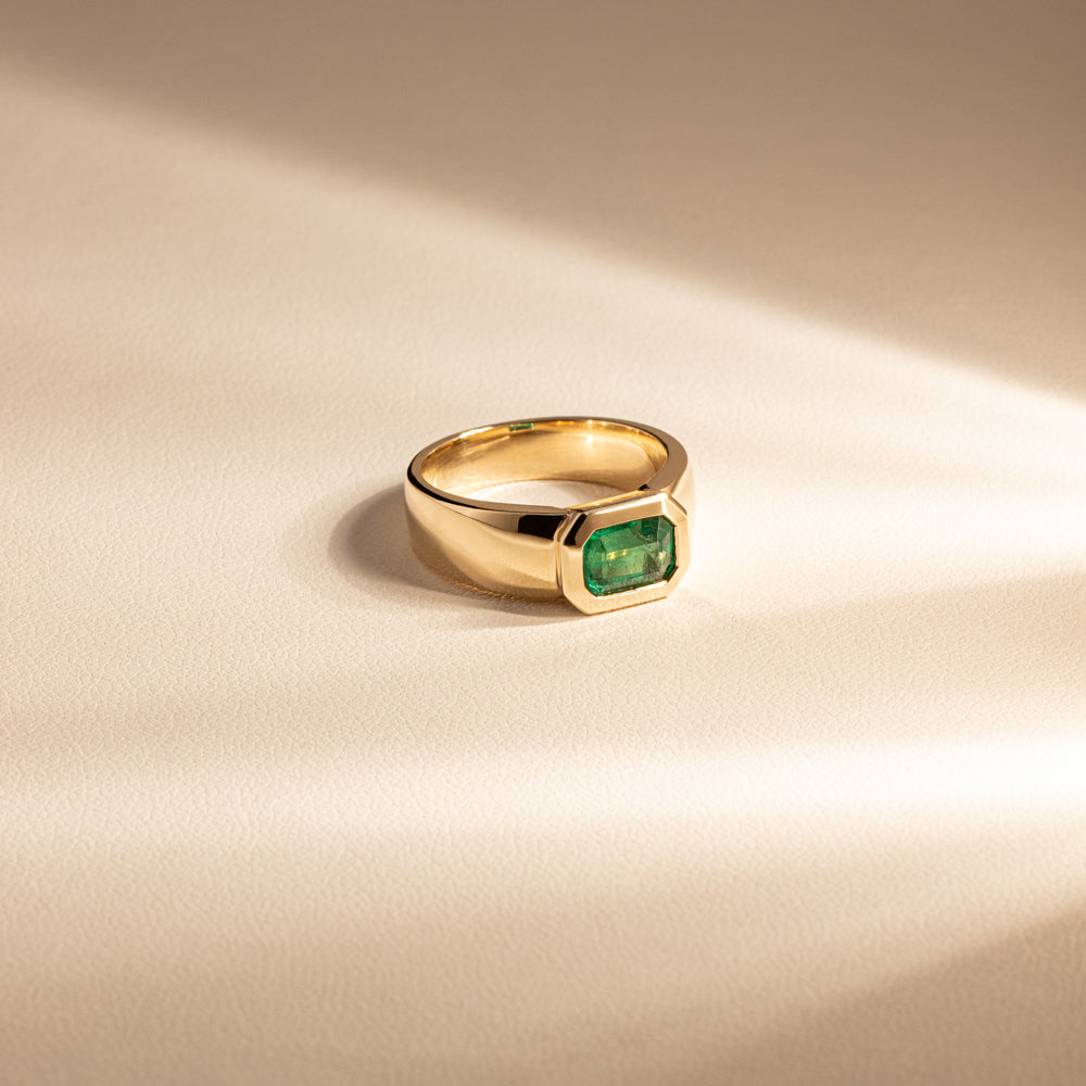 Crafted from beautiful 9ct yellow gold, this precious ring boasts a glossy emerald elegantly placed in a rub-over setting. You will love showing this special ring off to friends and family.