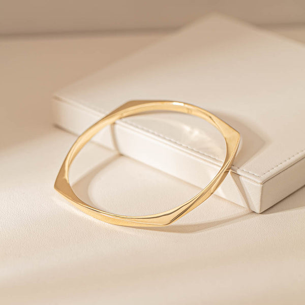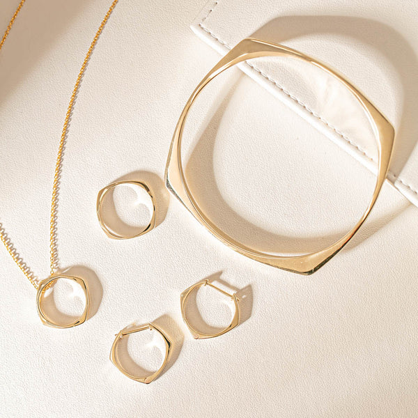 Crafted to perfection from shining 9ct yellow gold, this geometric bangle is from our Eos collection, which celebrates the first step and initial leap of faith towards a brighter future. Inspired by Eos; the Greek goddess of the dawn, this collection signifies the start of a new journey and the excitement and adventure that awaits. A wonderful gift idea for your loved one embarking on their travels, or starting an exciting new chapter of their life.