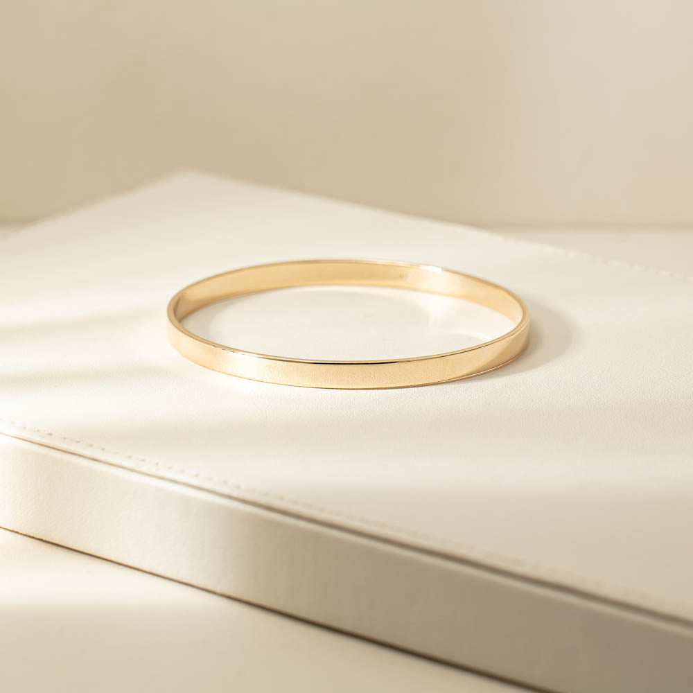 Slip on this sleek oval bangle to instantly elevate your style with timeless sophistication. This beautiful bangle, set in 9ct yellow gold catches the light with a breathtaking rich lustre.