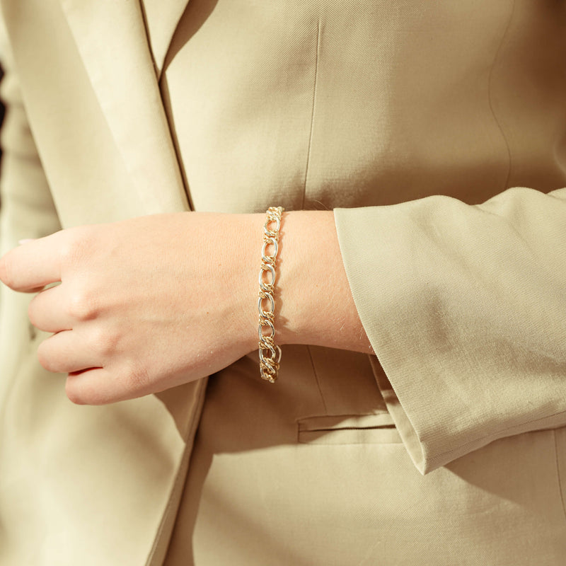 This Celtic Weave and Oval Curb Bracelet is a beautiful piece of jewellery. Crafted from 9ct yellow gold and sterling silver, it features a unique alternating link design that adds a sophisticated touch to any outfit.