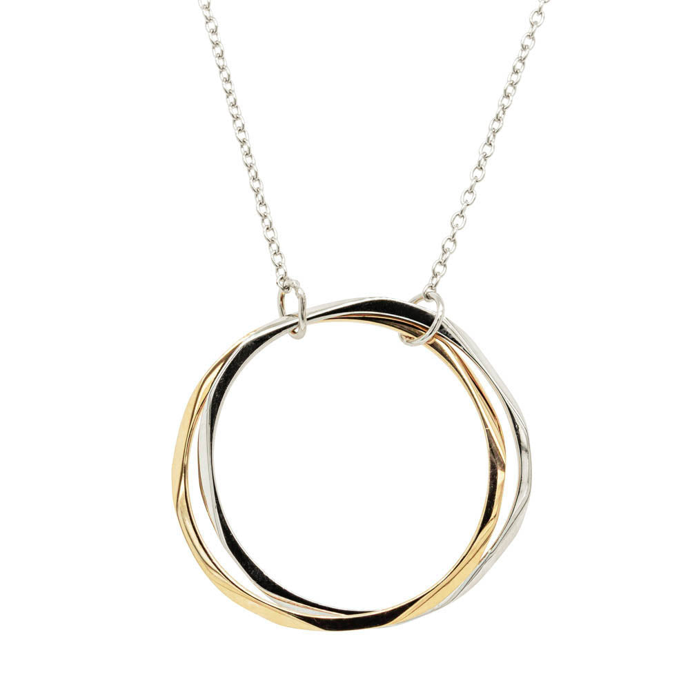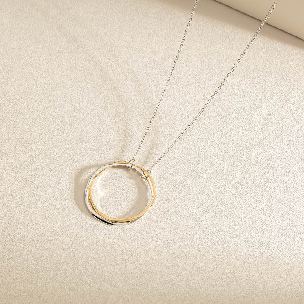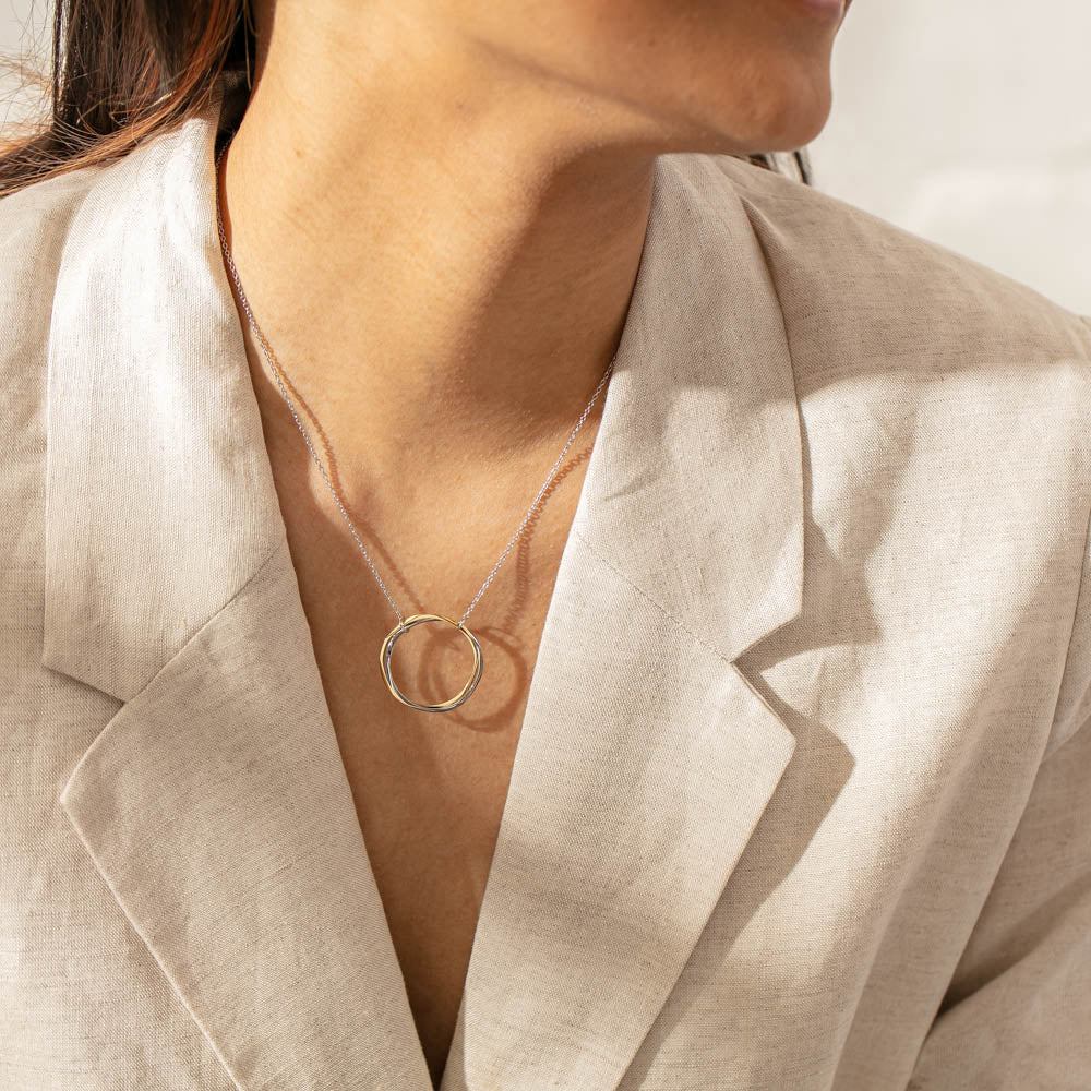 Two organic circles carefully crafted from 9ct yellow gold and sterling silver represent two journeys coming together. The joining of these precious circles reflects the strength of love and connection. Two parts entwined together in an inseparable bond.
