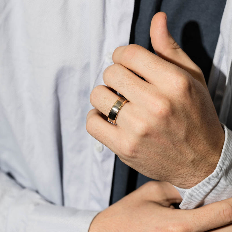 A classic ring he will cherish forever. Set in titanium and 9ct yellow gold, this stylish ring is 7mm wide. The strong and masculine design will transcend through fashion and remain stylish. A stunning piece to celebrate a special milestone with.