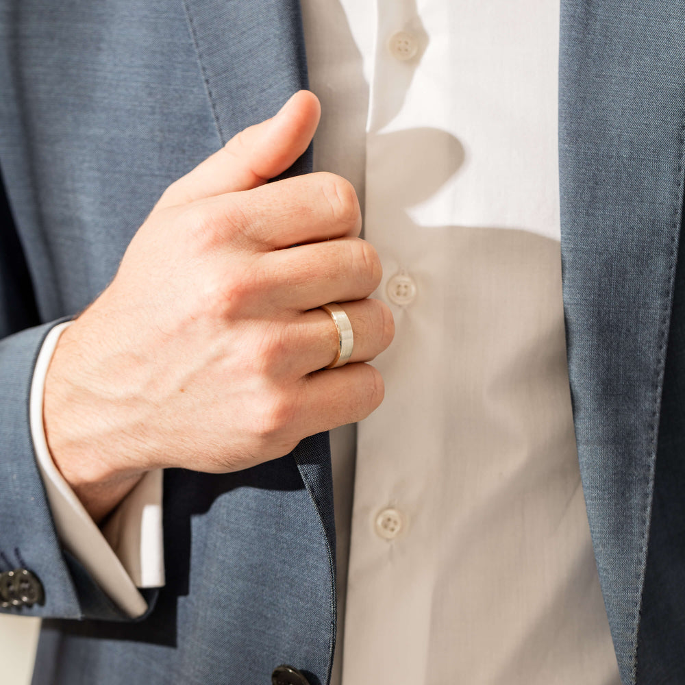 This 9ct white and yellow gold ring is 6mm wide and has a brushed finish. The ring has a stunning brushed finish and features both white and yellow gold. Expertly crafted and versatile!