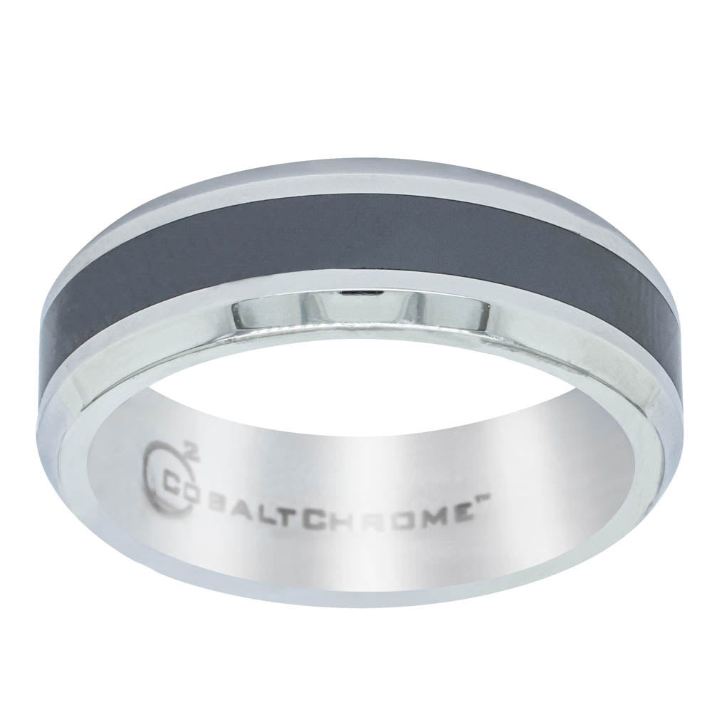 This Cobalt comfort-fit band features a seranite inlay centre and high polished beveled edges.