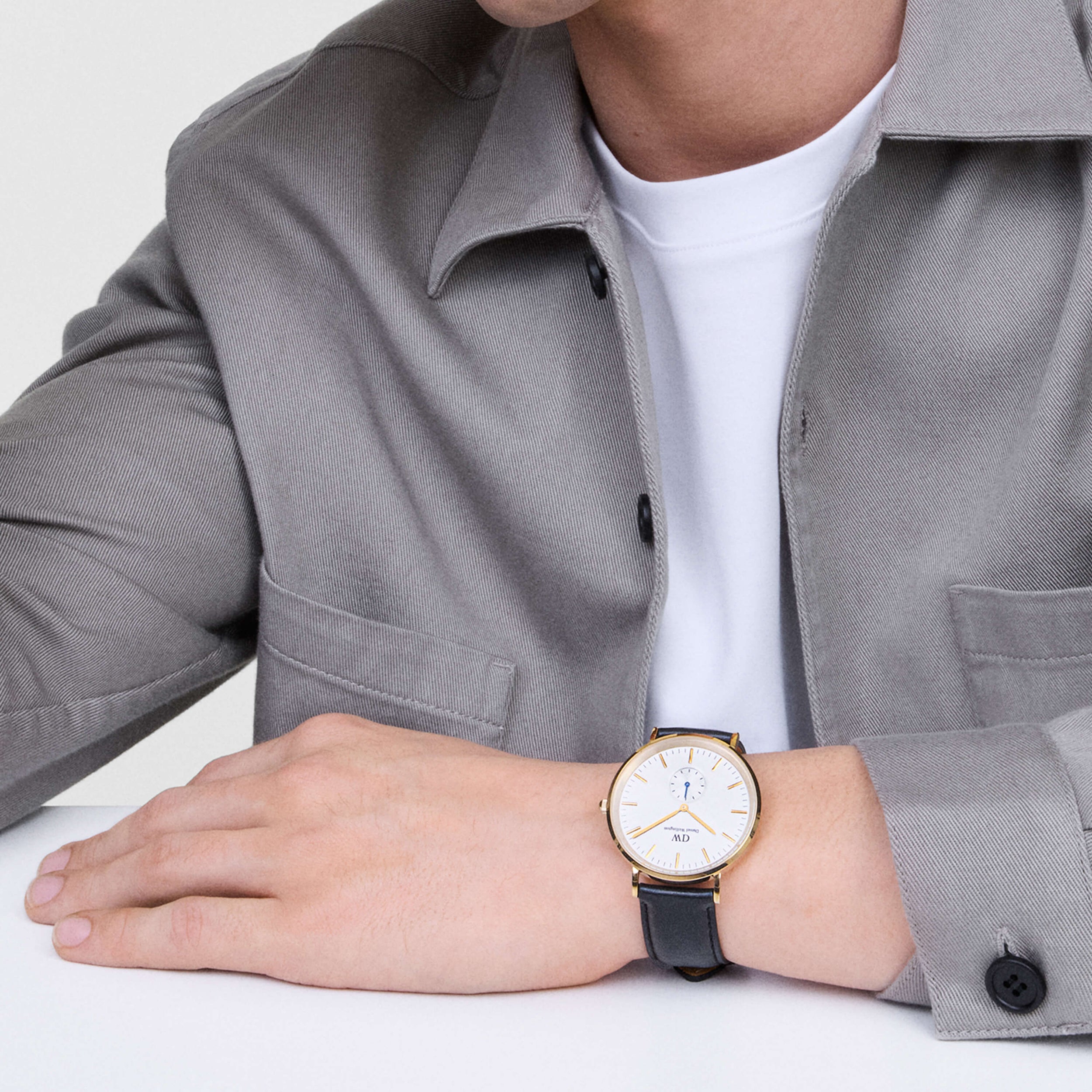 Model wearing Daniel Wellington watch with leather strap