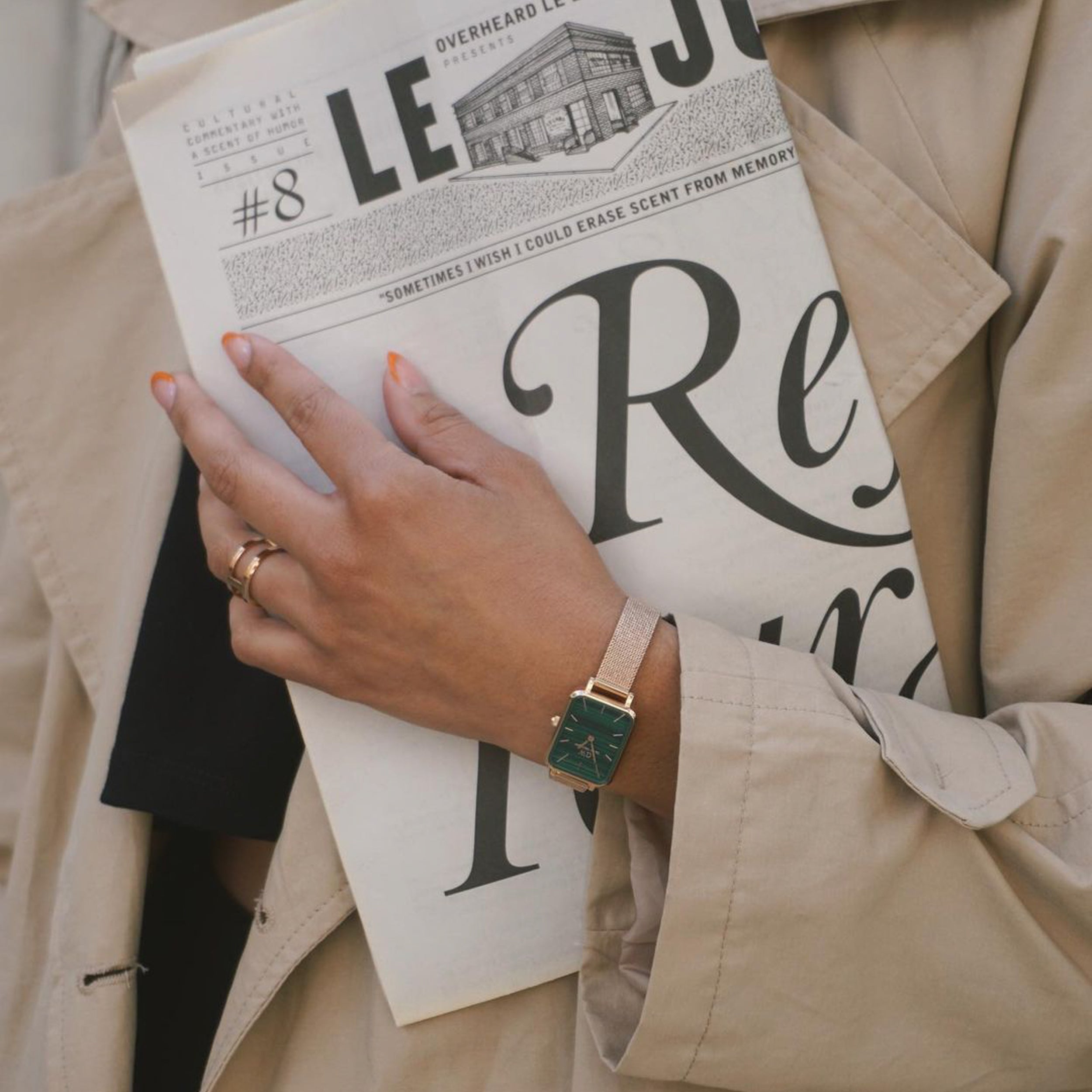 The Quadro Pressed Evergold is beautiful from all the angles—pun intended! This women’s gold watch brings together our signature square, green watch face and a refined gold mesh bracelet. This is crafted from stainless steel with a gold finish, woven in a glistening fabric-like texture that feels pleasant on the wrist. So, when you want to give your look a bit of an edge, choose this timepiece or another from our collection of angular green dial watches. Women's gold watch with a square green watch face. Paired with gold mesh bracelet.