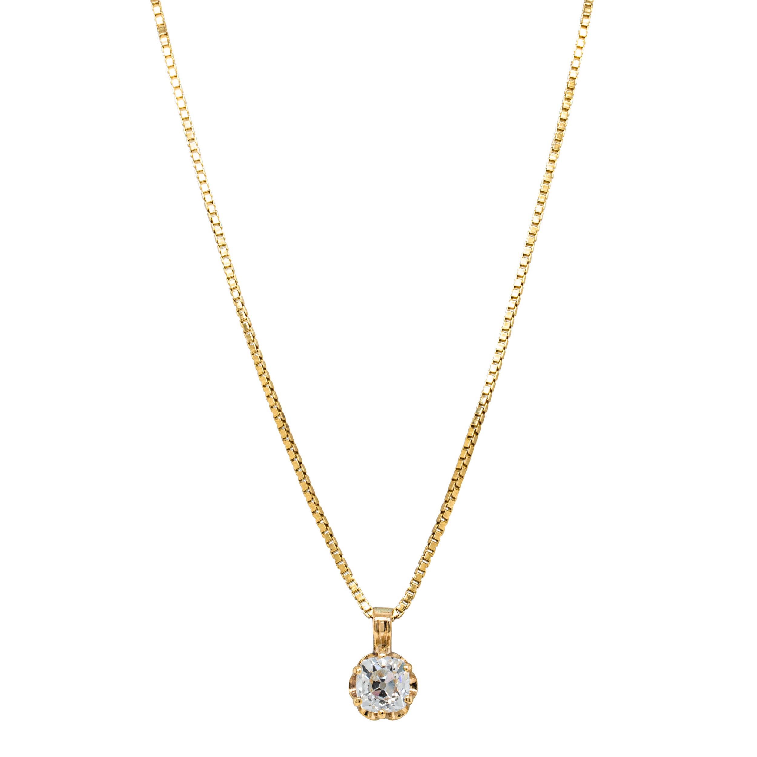 Pendant rests on a 45cm 14ct yellow gold box link chain, secured with a parrot claw clasp.