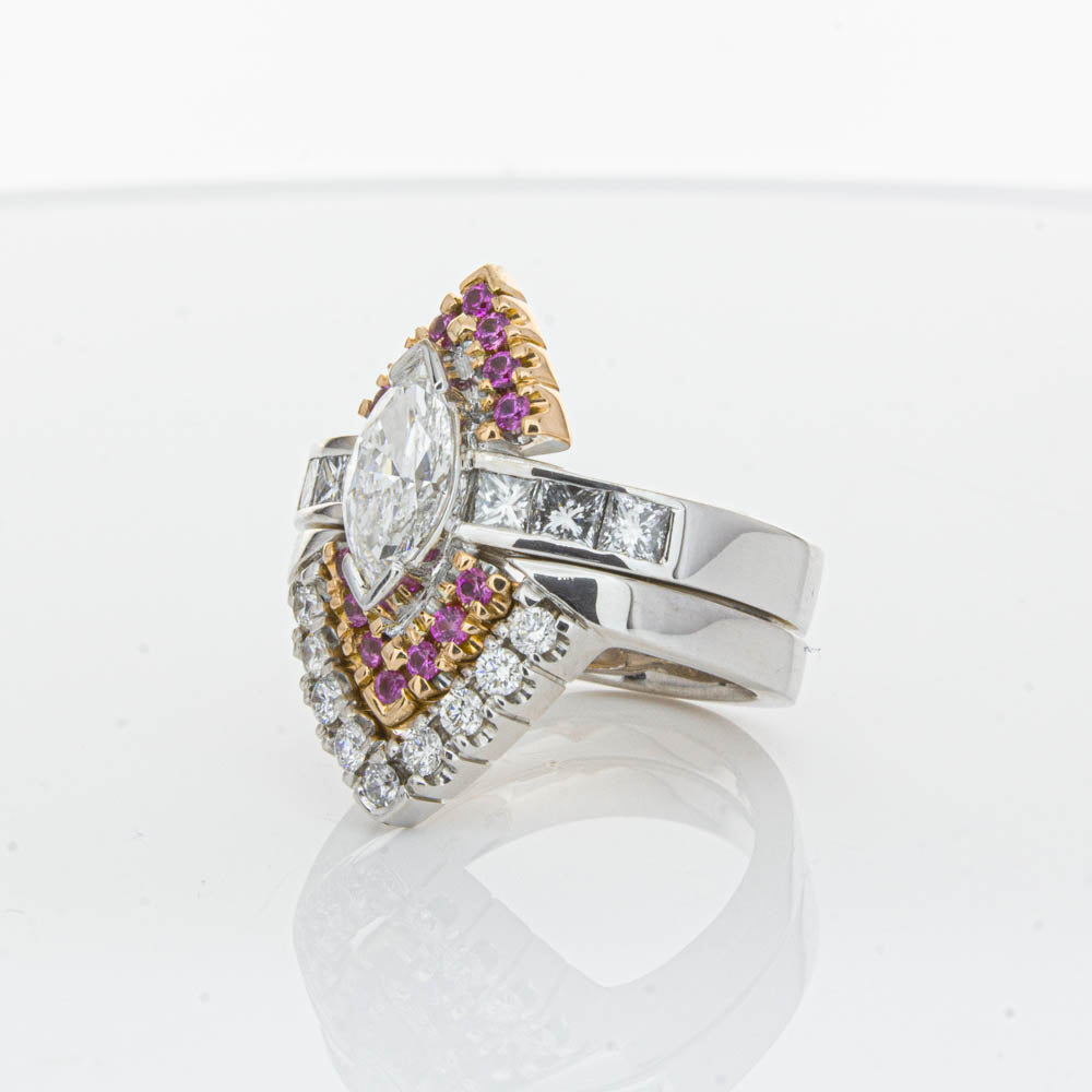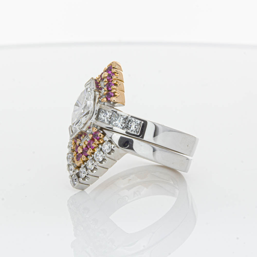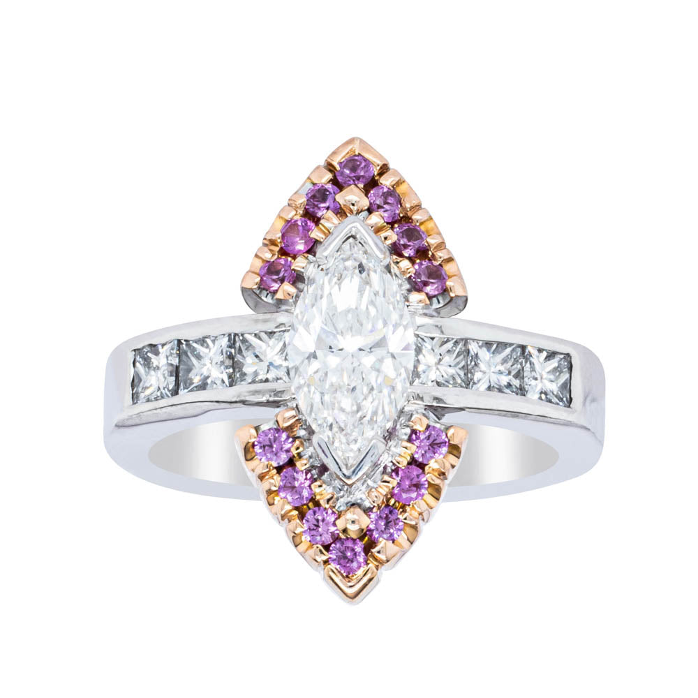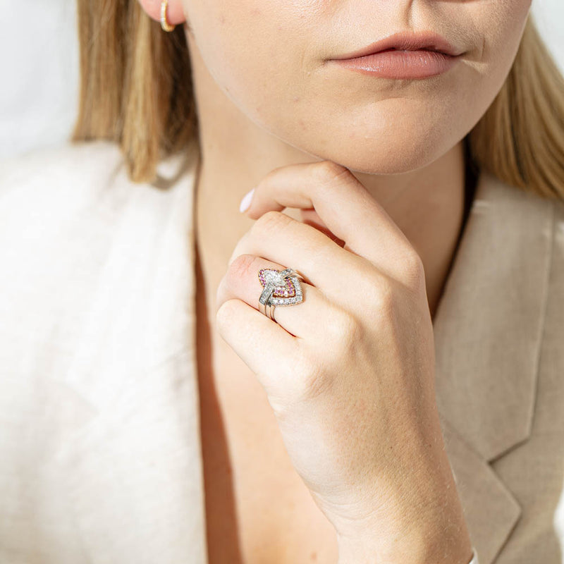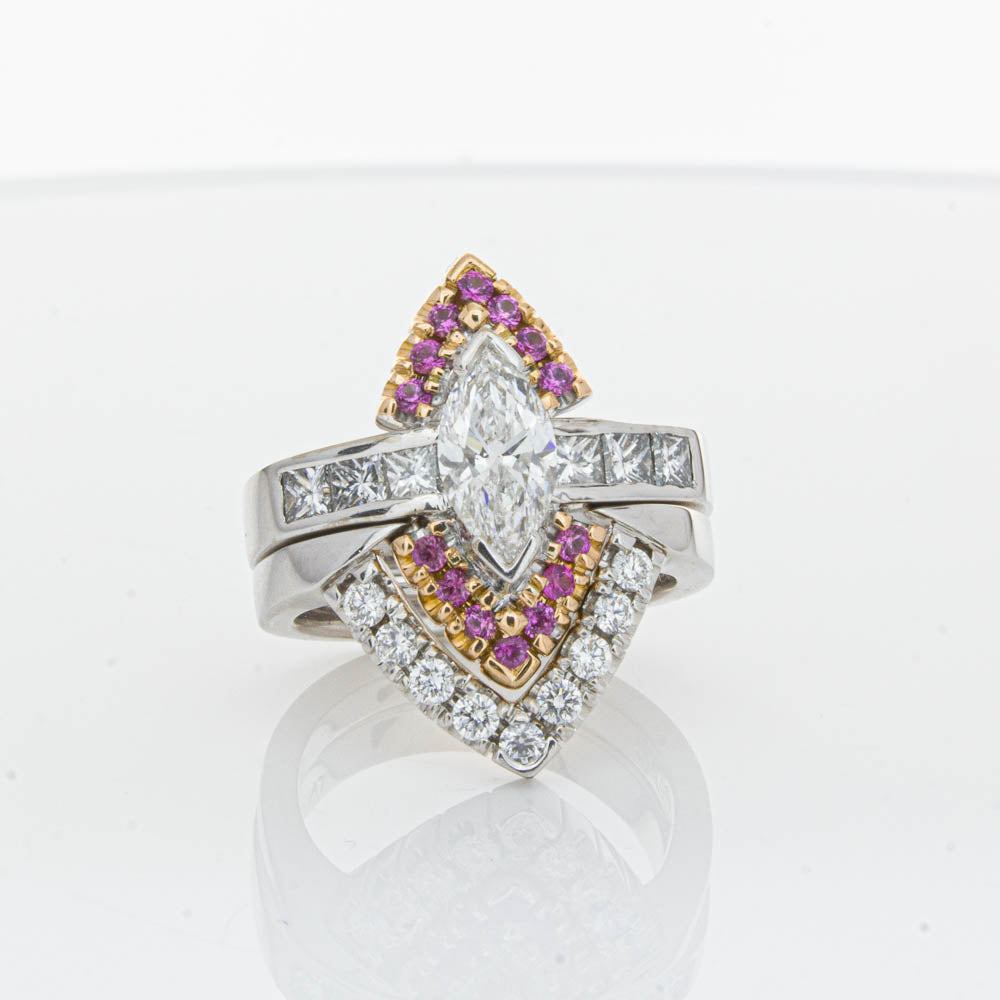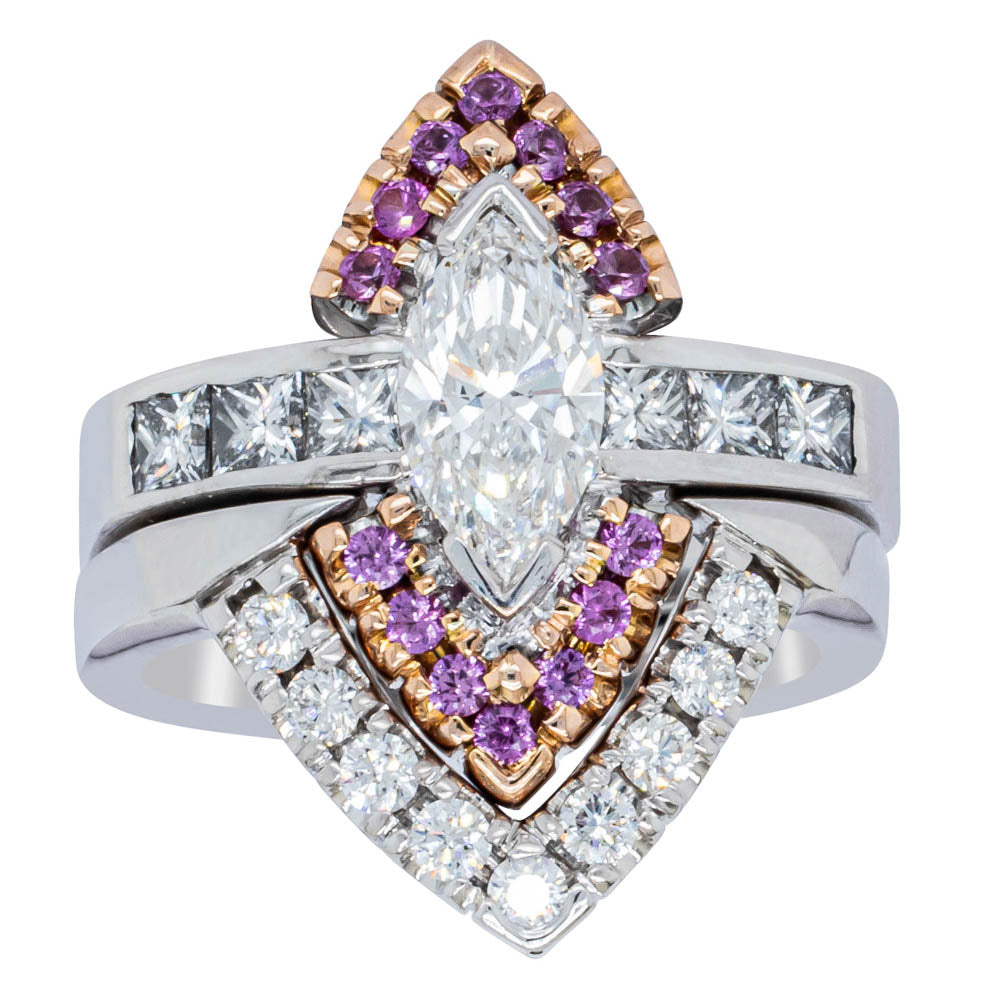 Feel timelessly elegant with this luxurious Deja Vu ring set. This 18ct white and rose gold jewellery set features a central marquise diamond surrounded by pink sapphires and diamond channel set shoulders. It also includes a fitted diamond set band that adds sparkle and subtle sophistication to the look.