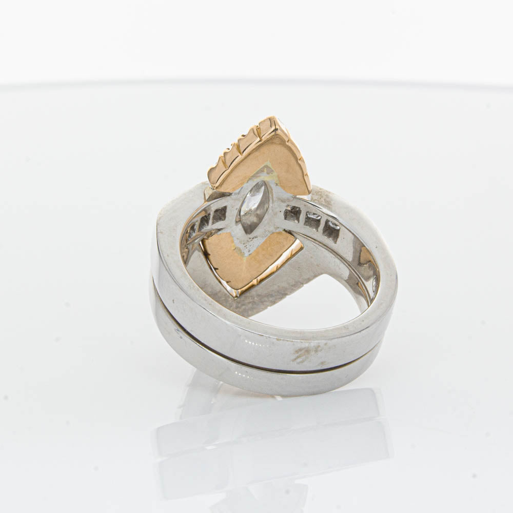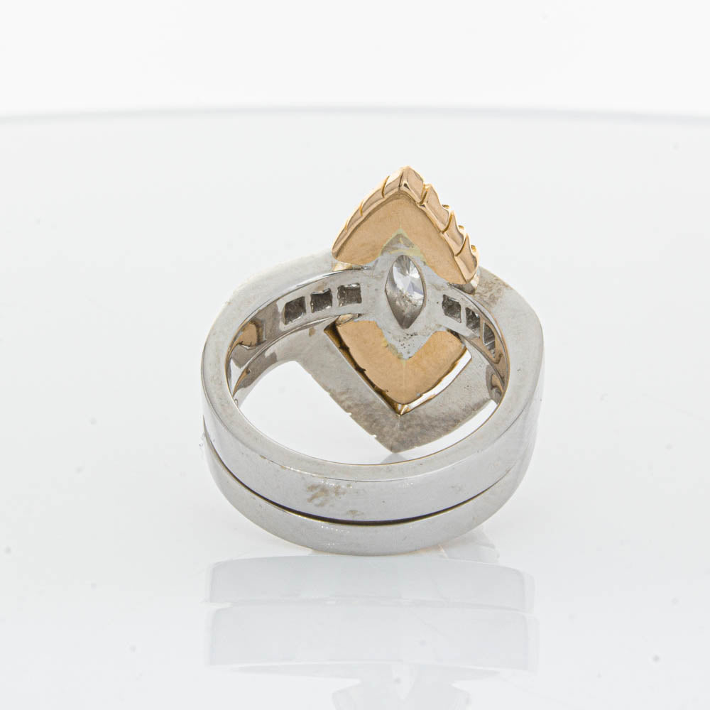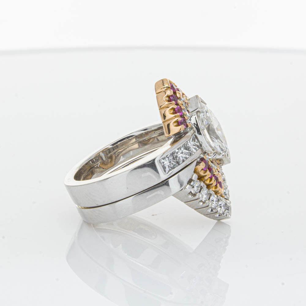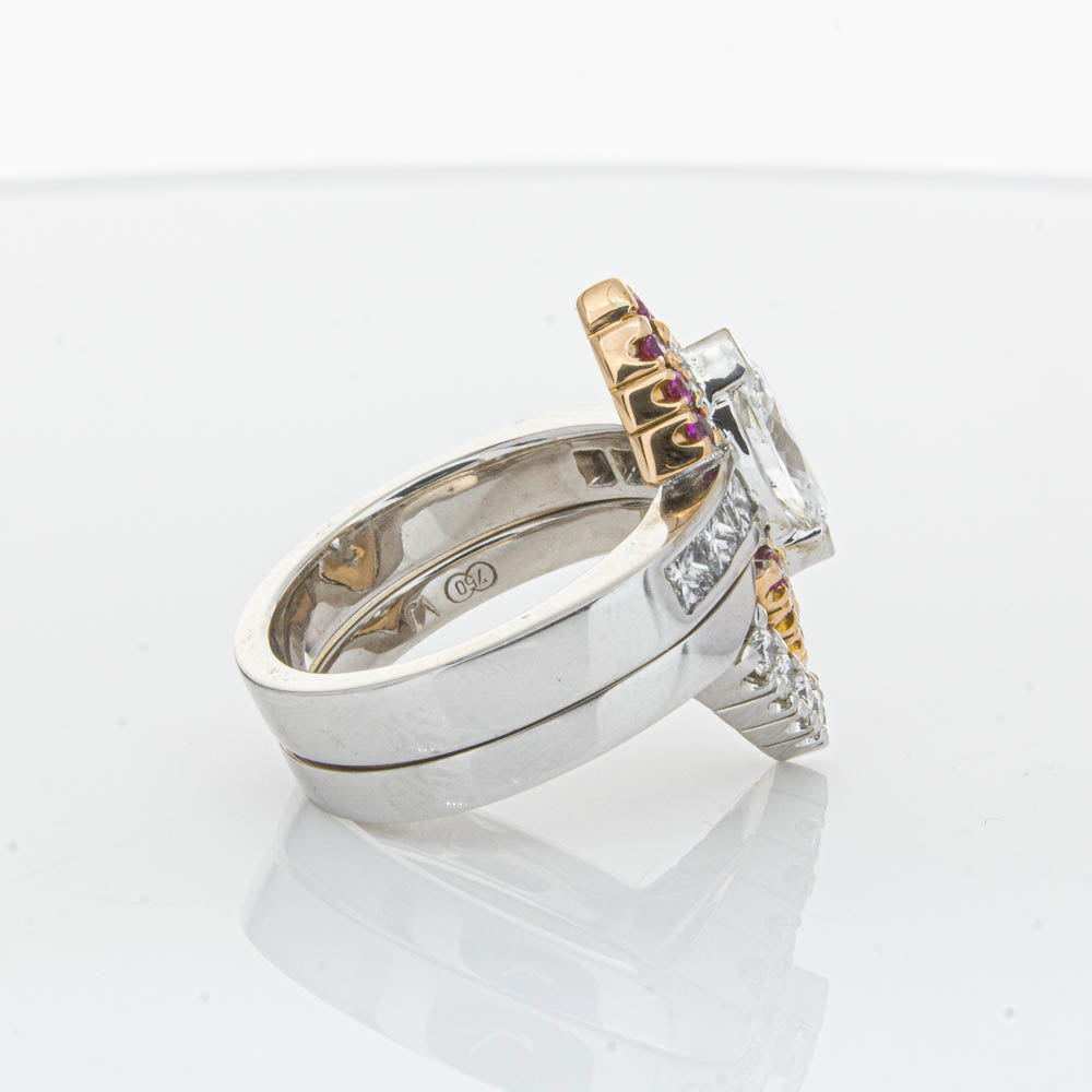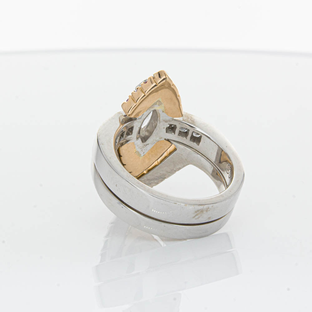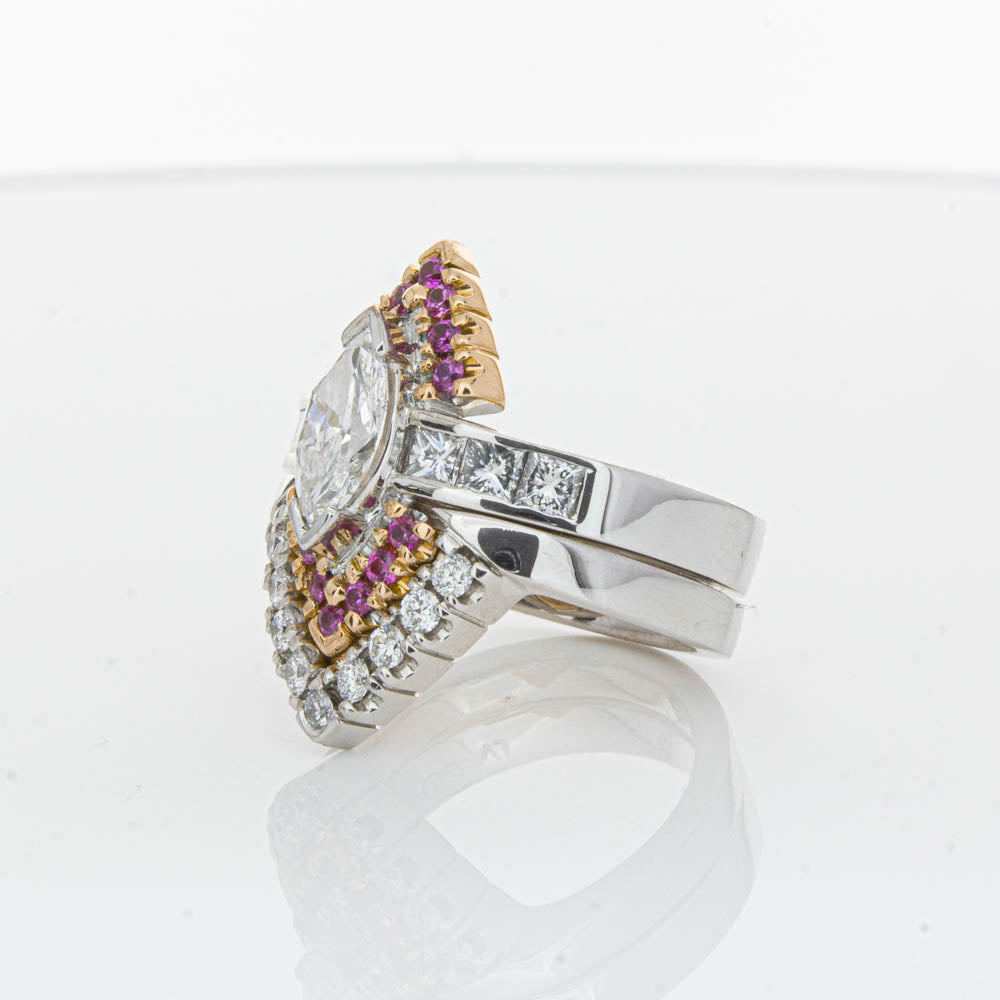 Feel timelessly elegant with this luxurious Deja Vu ring set. This 18ct white and rose gold jewellery set features a central marquise diamond surrounded by pink sapphires and diamond channel set shoulders. It also includes a fitted diamond set band that adds sparkle and subtle sophistication to the look.