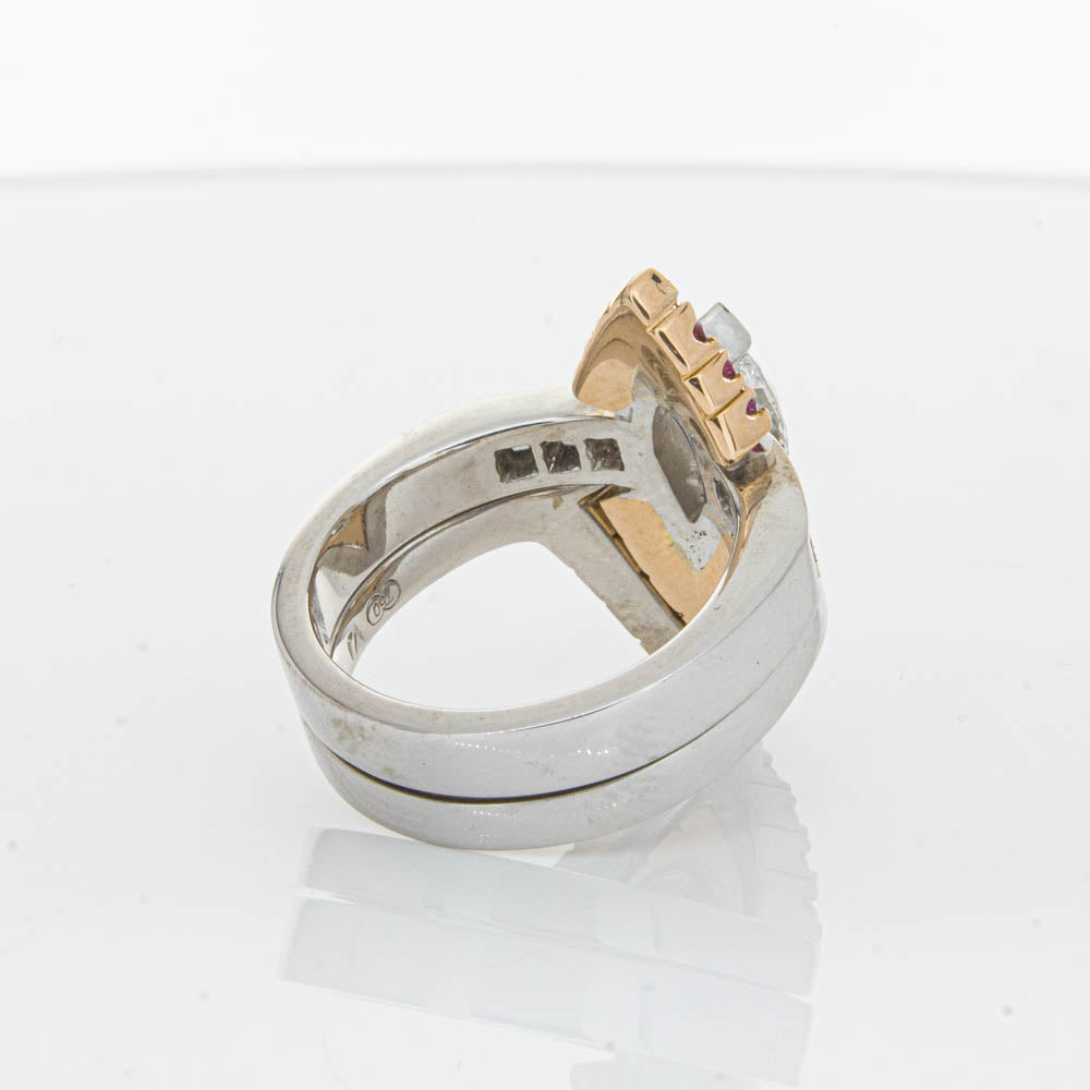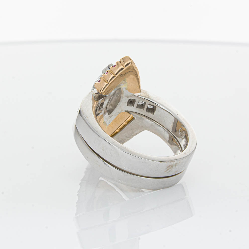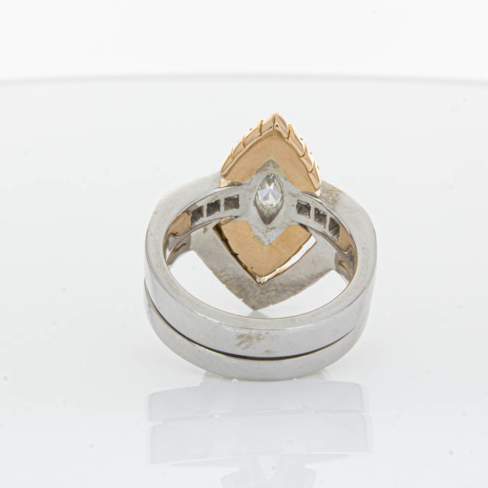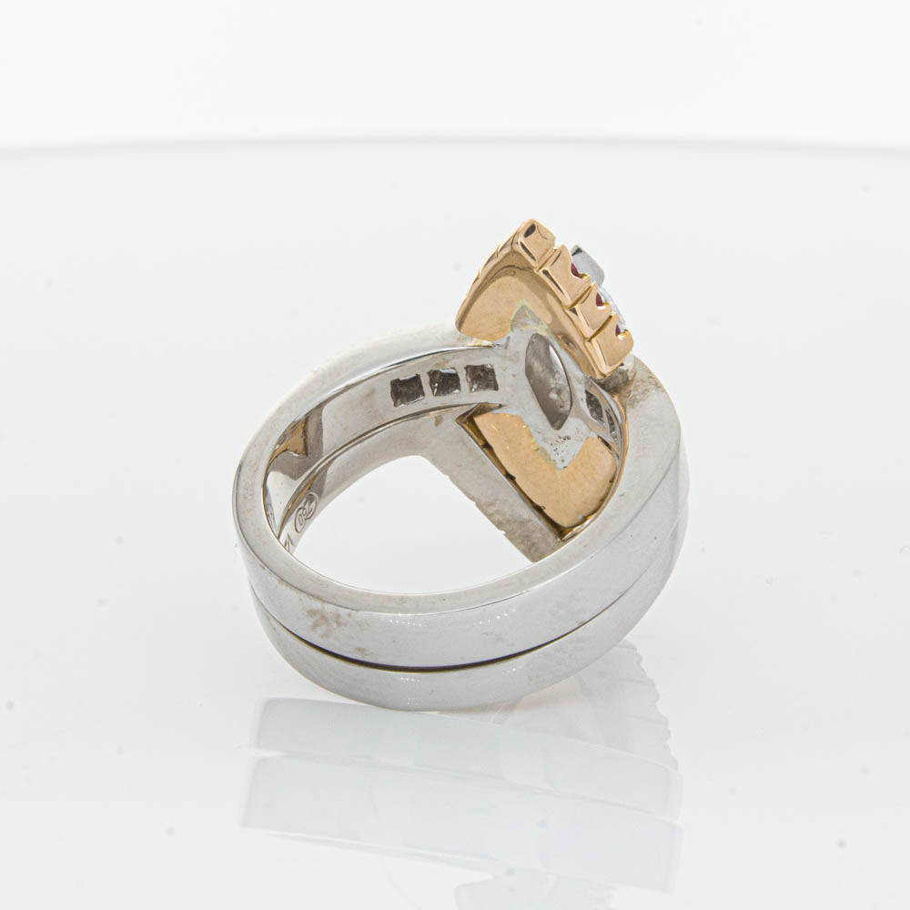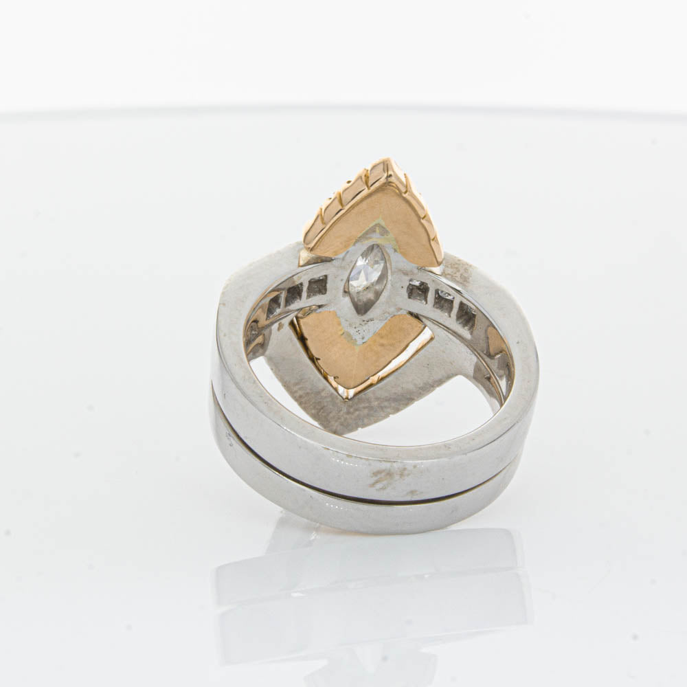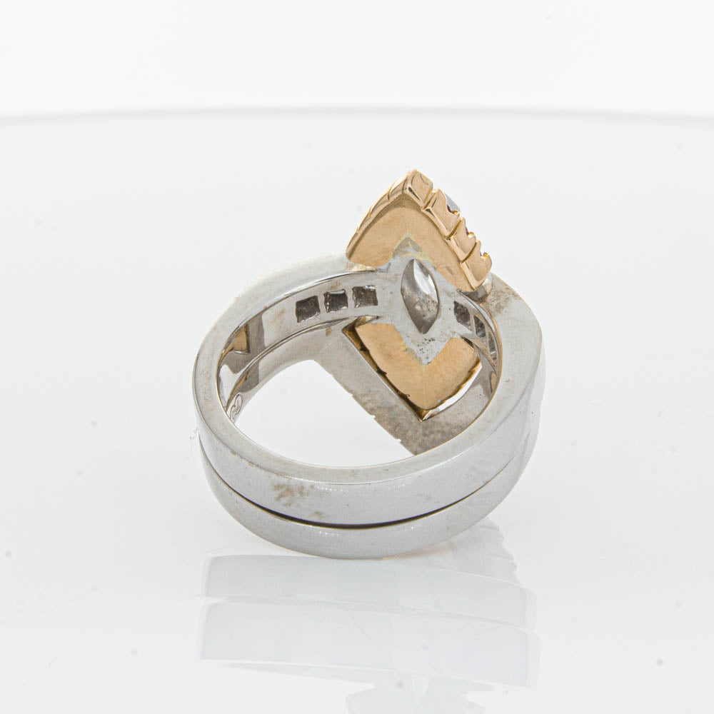 Feel timelessly elegant with this luxurious Deja Vu ring set. This 18ct white and rose gold jewellery set features a central marquise diamond surrounded by pink sapphires and diamond channel set shoulders. It also includes a fitted diamond set band that adds sparkle and subtle sophistication to the look.