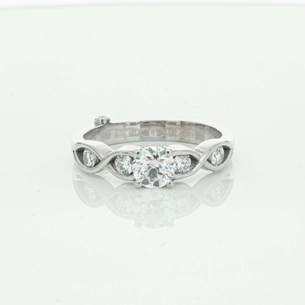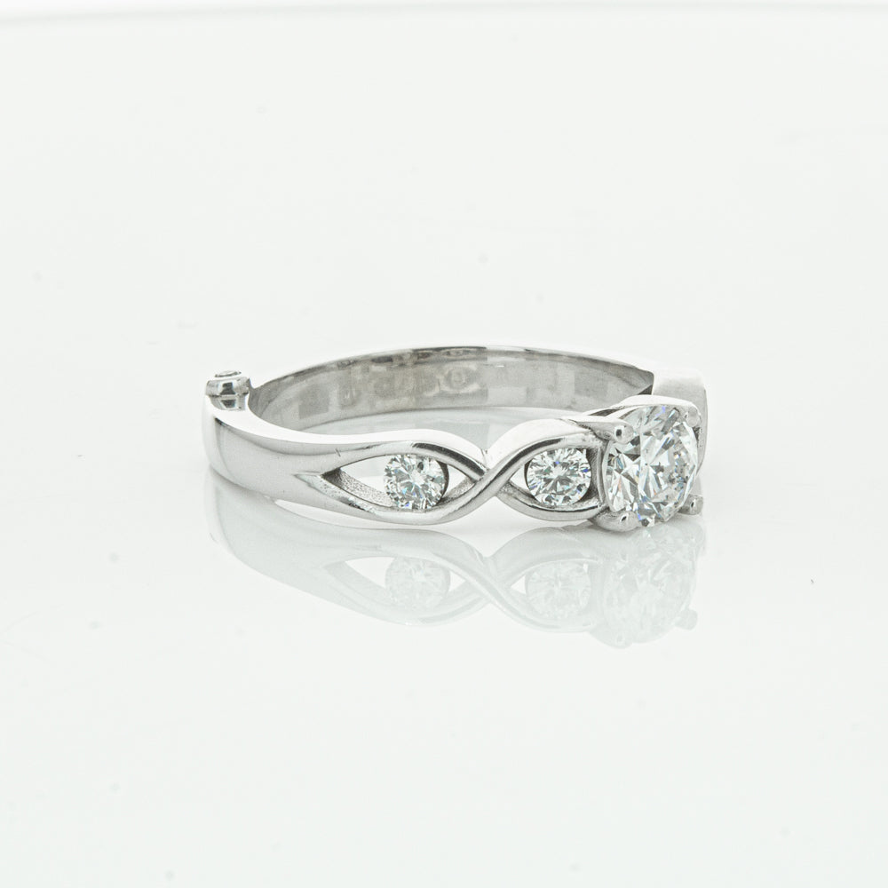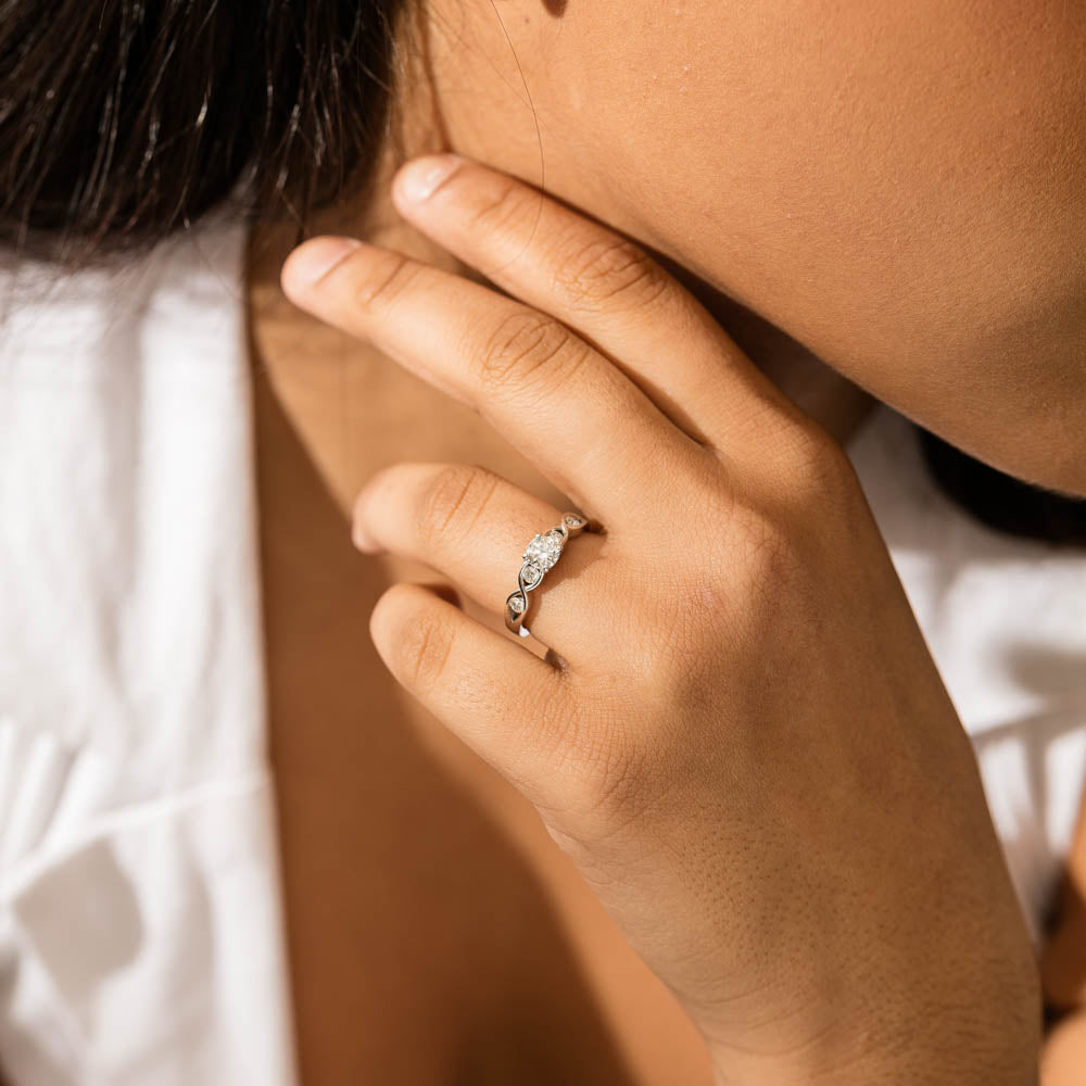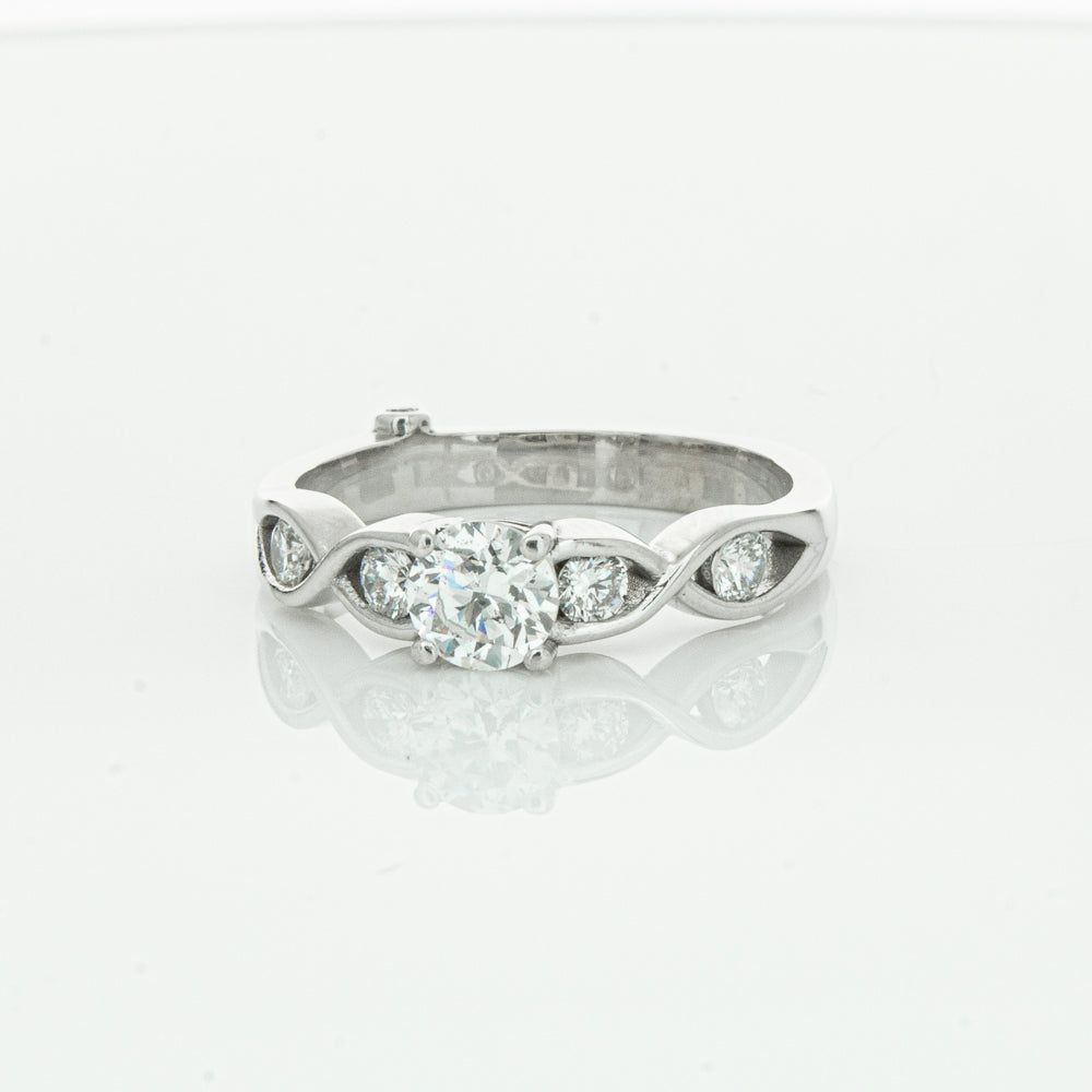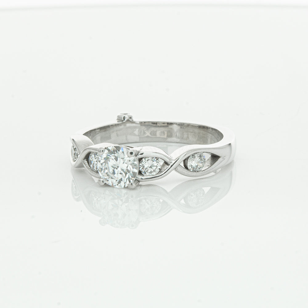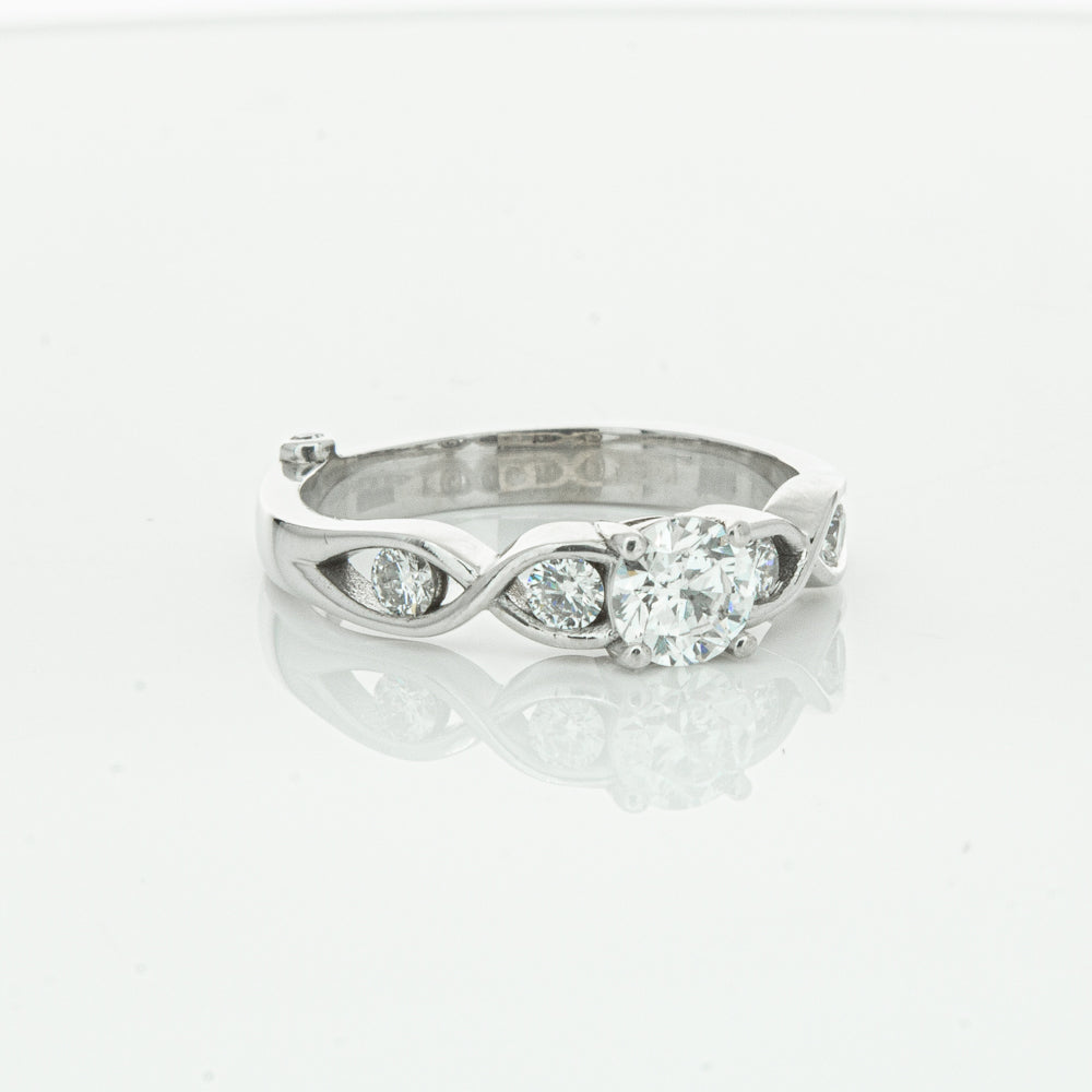 This elegant 9ct white gold Deja Vu ring features a round brilliant diamond with four round brilliant cuts and a single accent diamonds set in intertwining channels on the band adding extra sparkle to its brilliance.