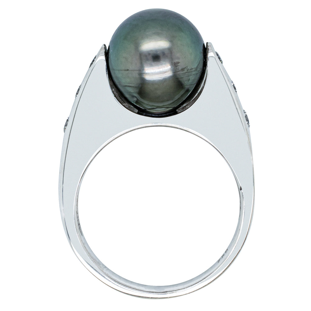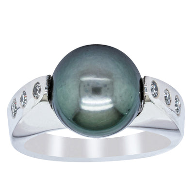 From our Deja Vu collection is this stunning black pearl ring. Featuring a 10.4mm round black pearl hugged on either side with 18ct white gold diamond set shoulders.