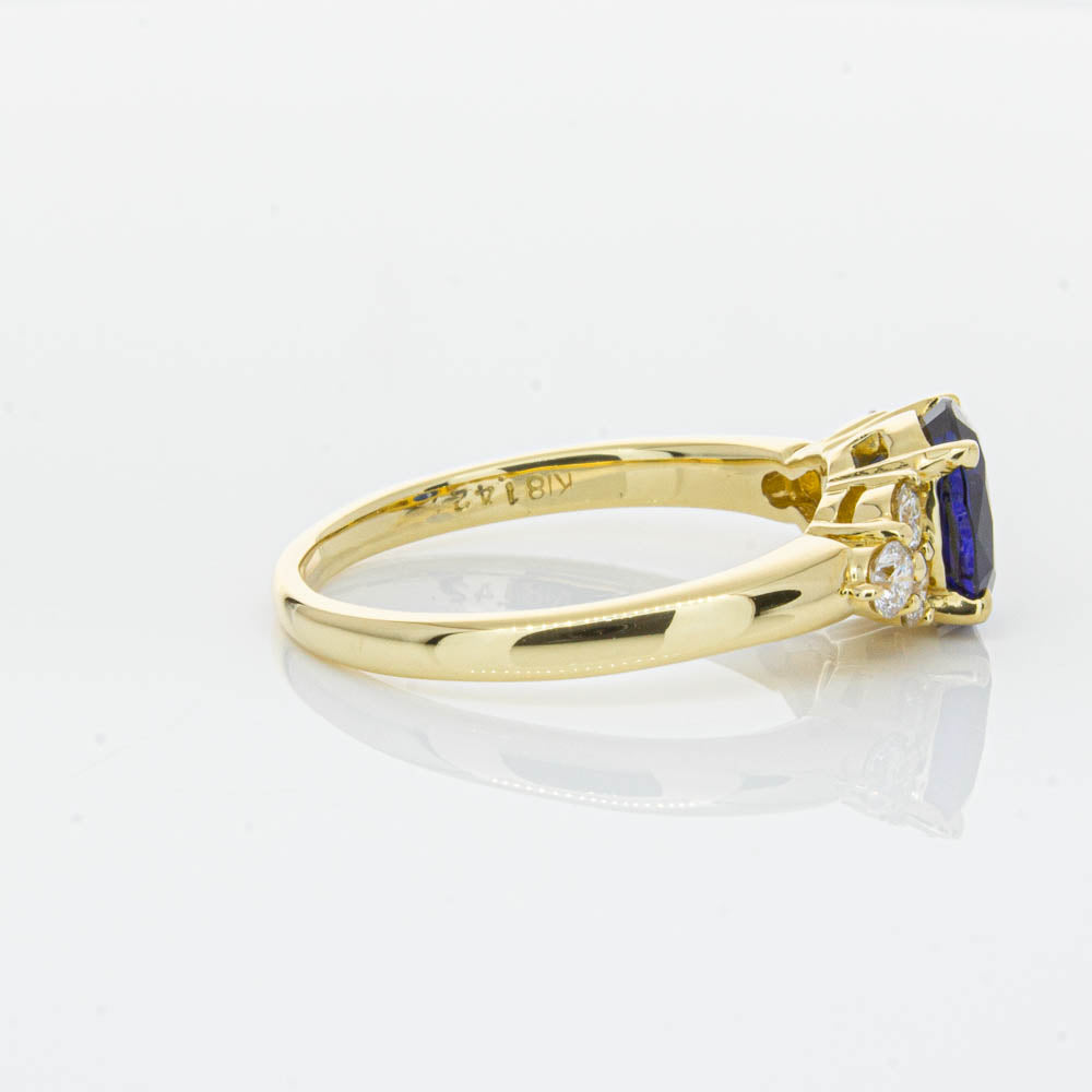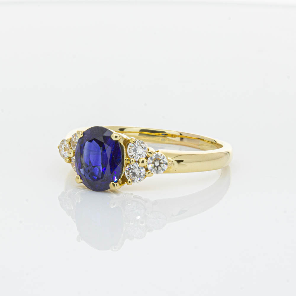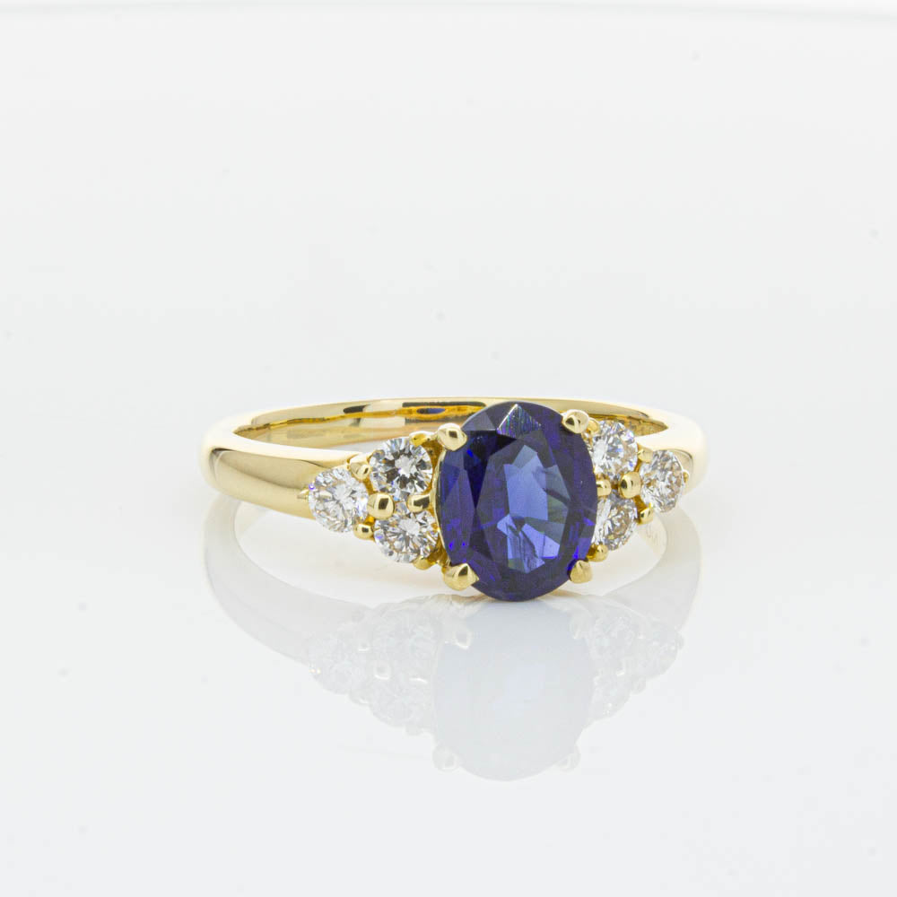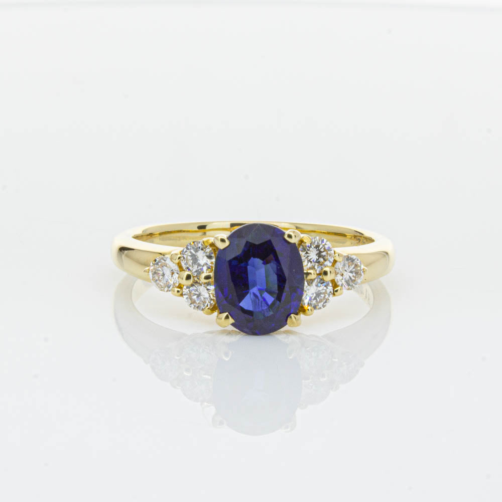 A timeless classic. This Deja Vu find is set in 18ct yellow gold. It boasts a 1.42ct oval faceted sapphire nestled between diamond shoulders.
