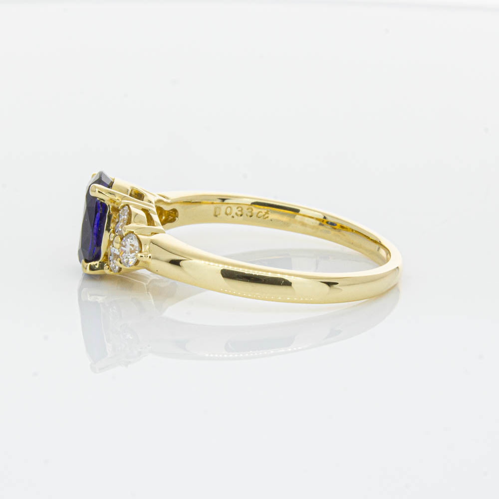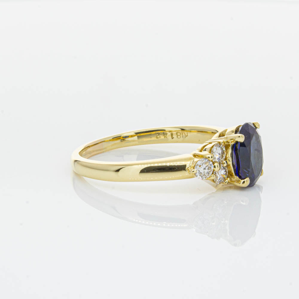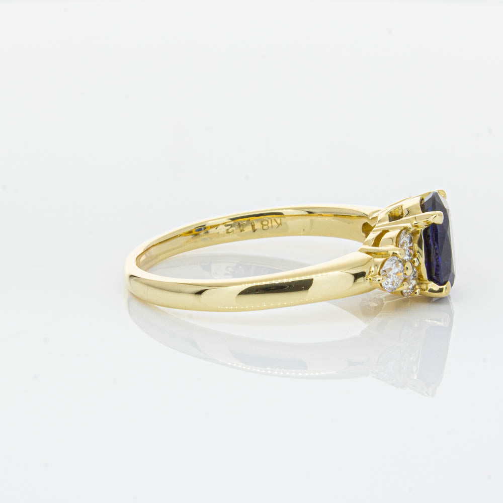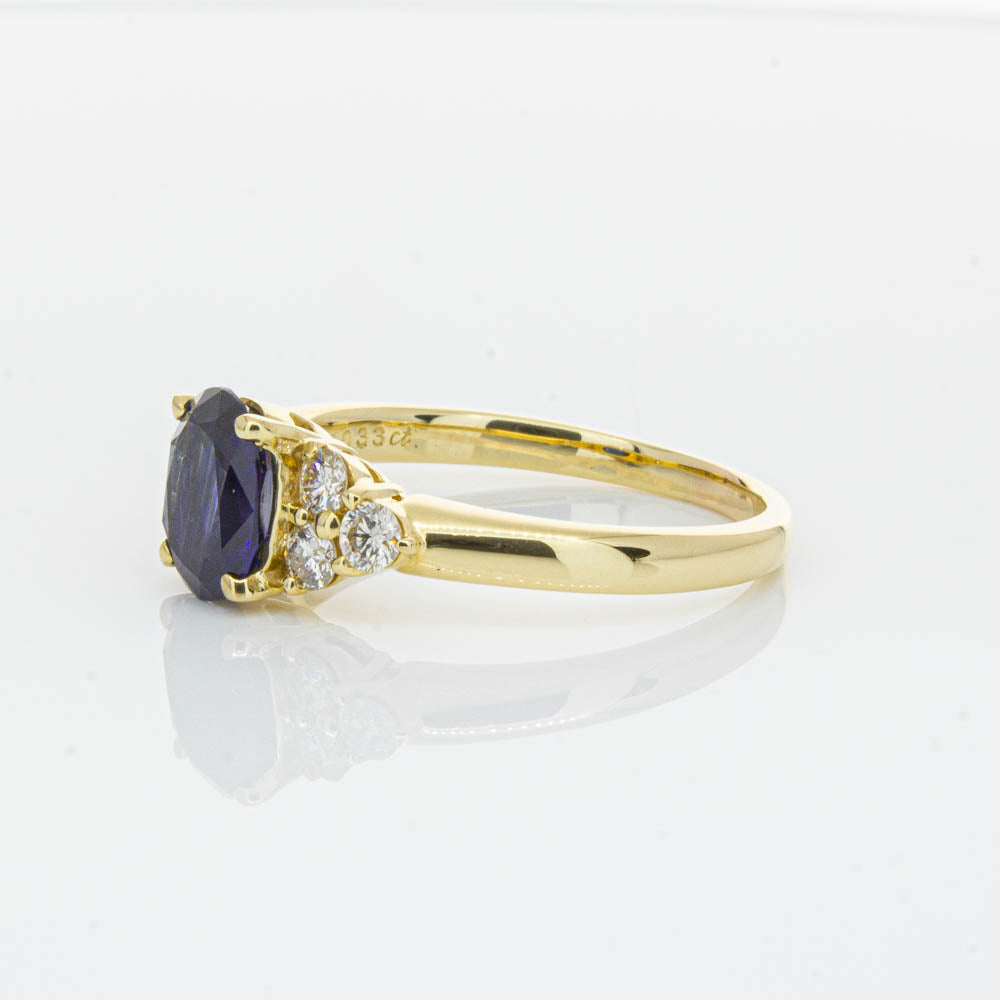 A timeless classic. This Deja Vu find is set in 18ct yellow gold. It boasts a 1.42ct oval faceted sapphire nestled between diamond shoulders.