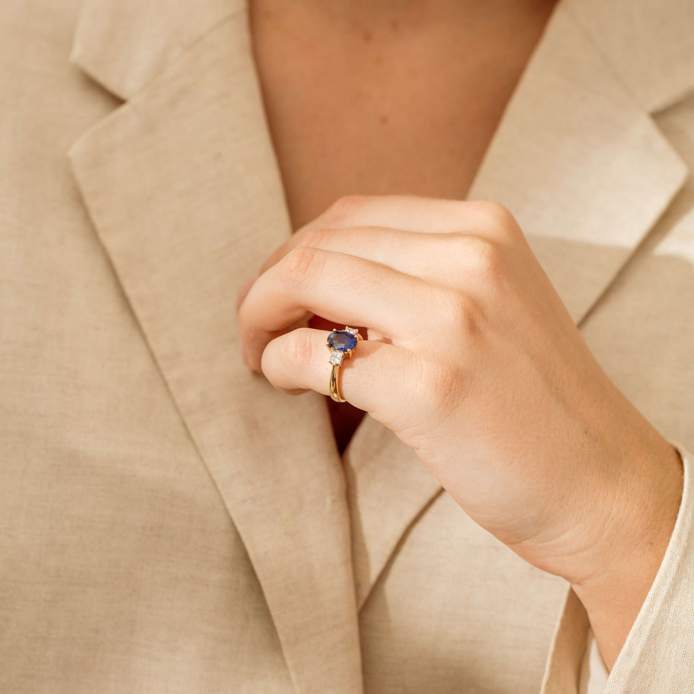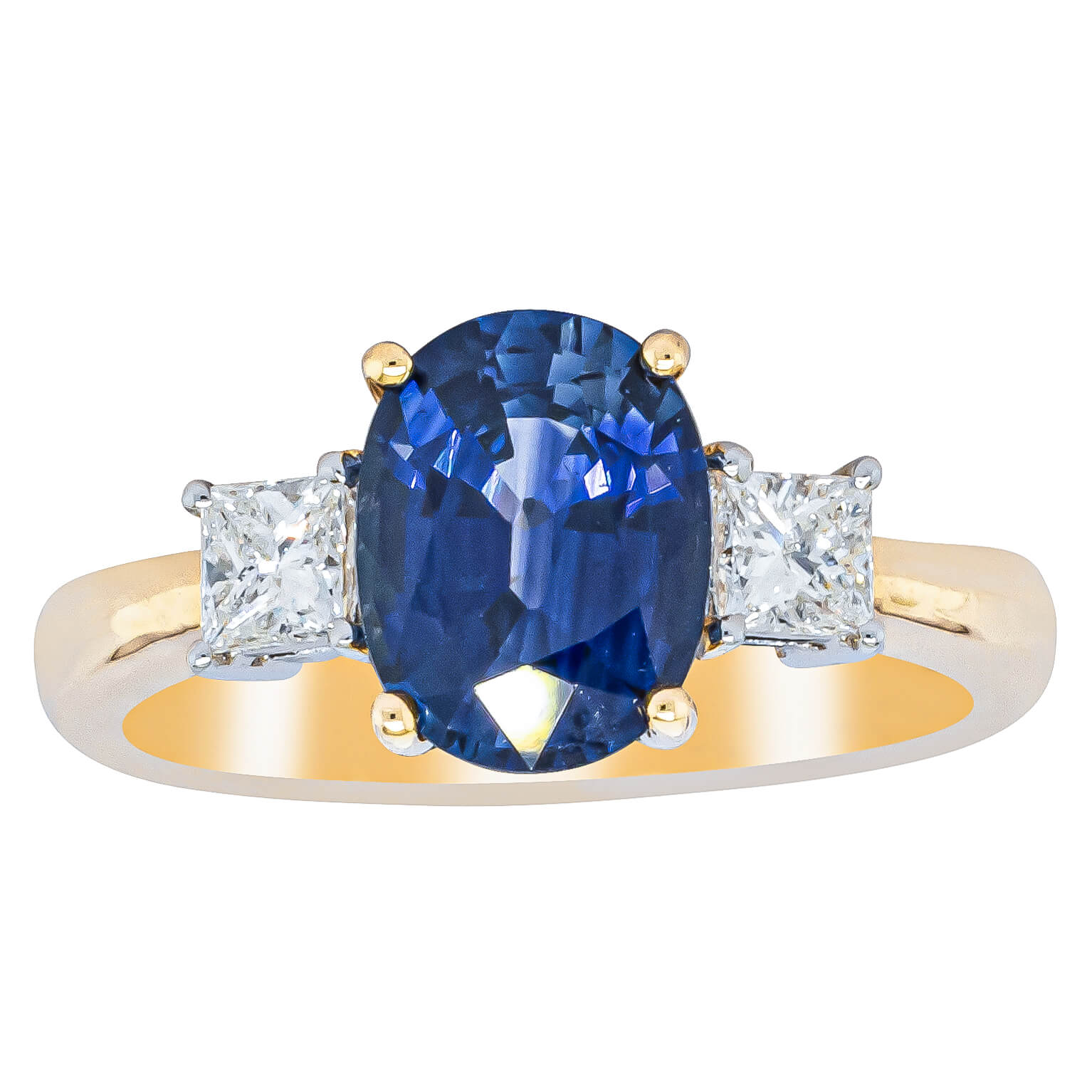 A timeless classic. This 18ct yellow gold Deja Vu ring boasts a deep blue oval faceted sapphire nestled between two princess cut diamonds. This exquisite ring is a must-have for any jewellery collection.