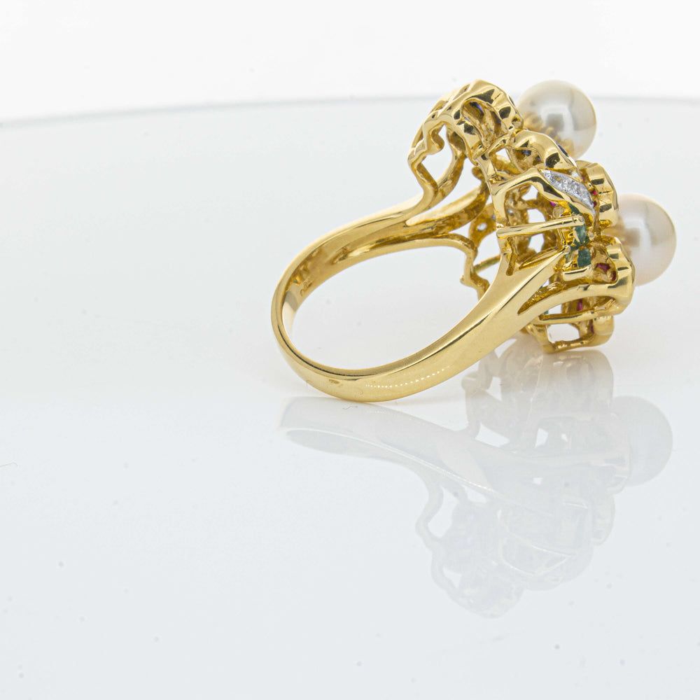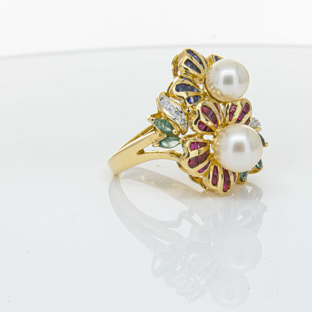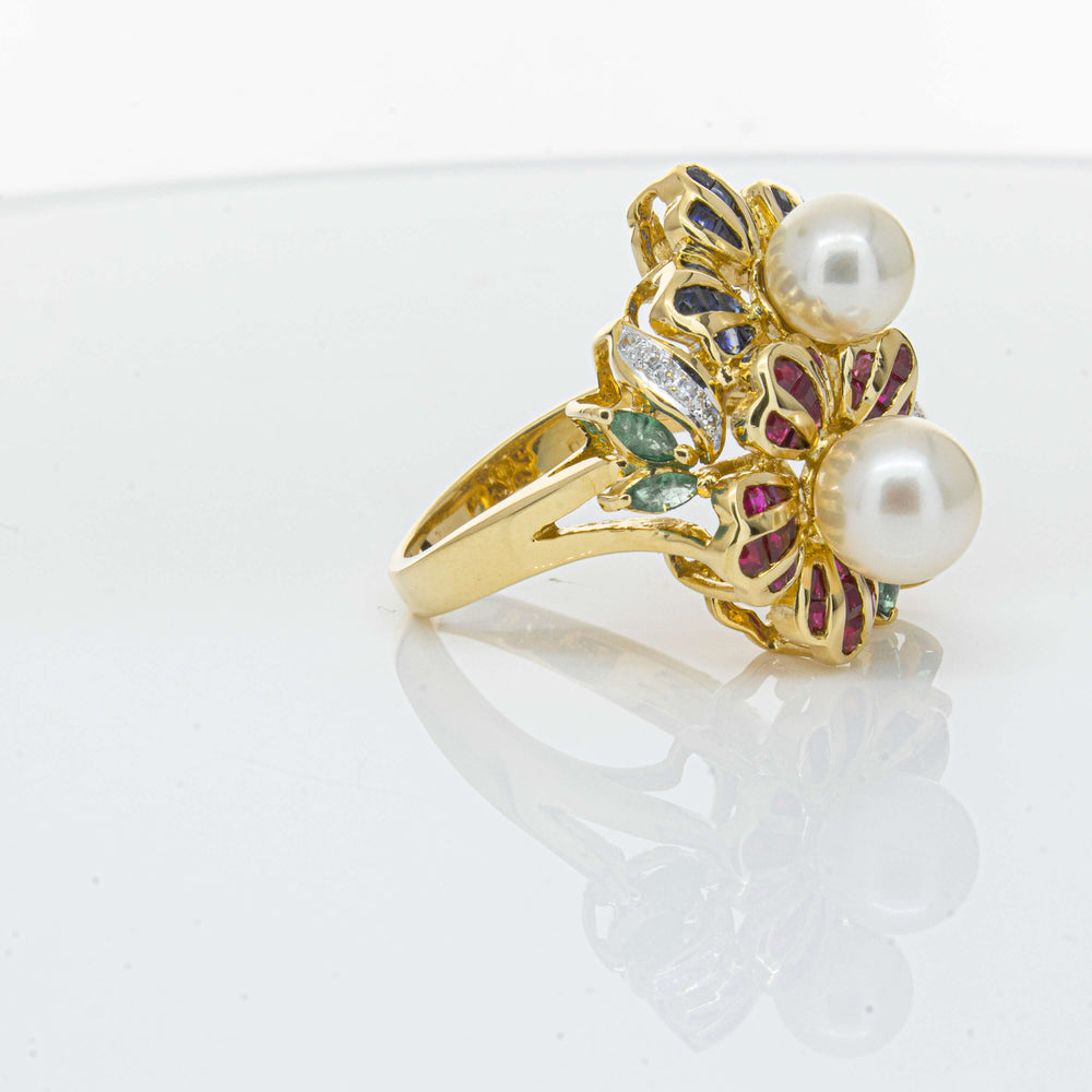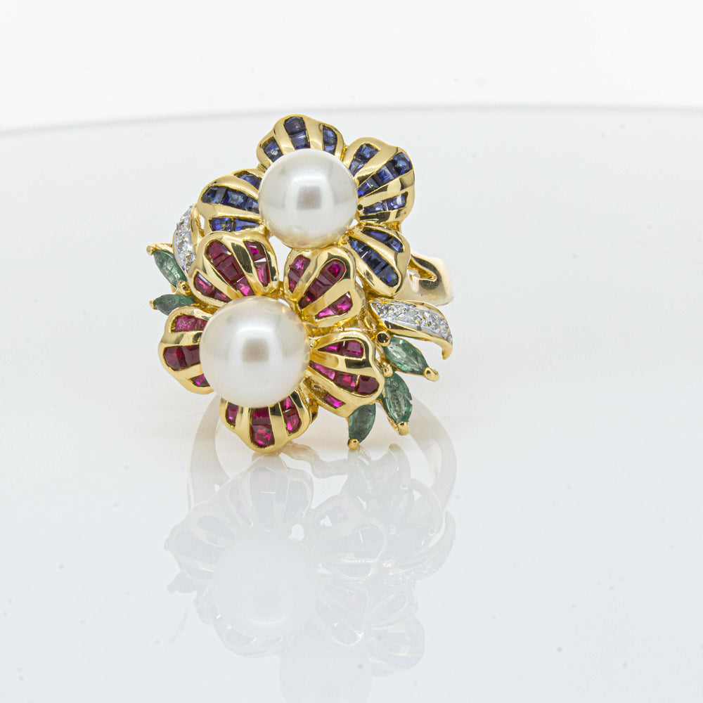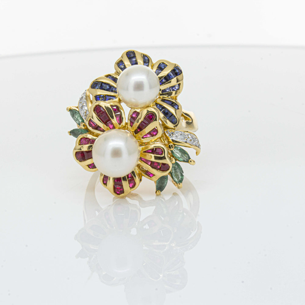 This Deja Vu ring features two cultured pearls and multi-coloured gemstones scattered in a 18ct yellow gold floral setting. Showcasing pearls, sapphires, rubies, emeralds, and diamonds - you will be the centre of attention.
