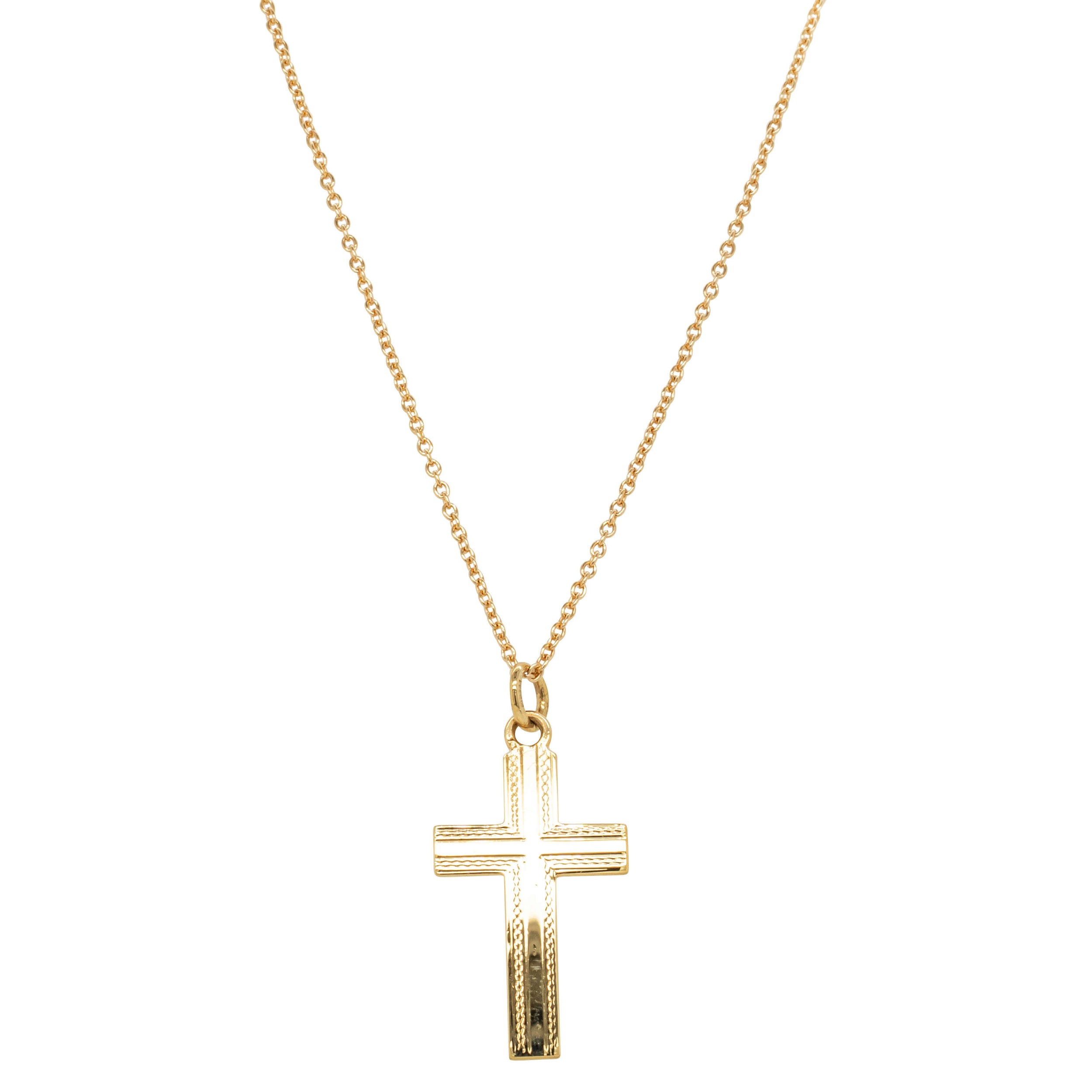 They will cherish this gorgeous Deja Vu 9ct yellow gold cross pendant from the 1980s. It has a polished finish with engraved outlines. This is a pendant that will make a bold addition to your collection. Birmingham 1986.
