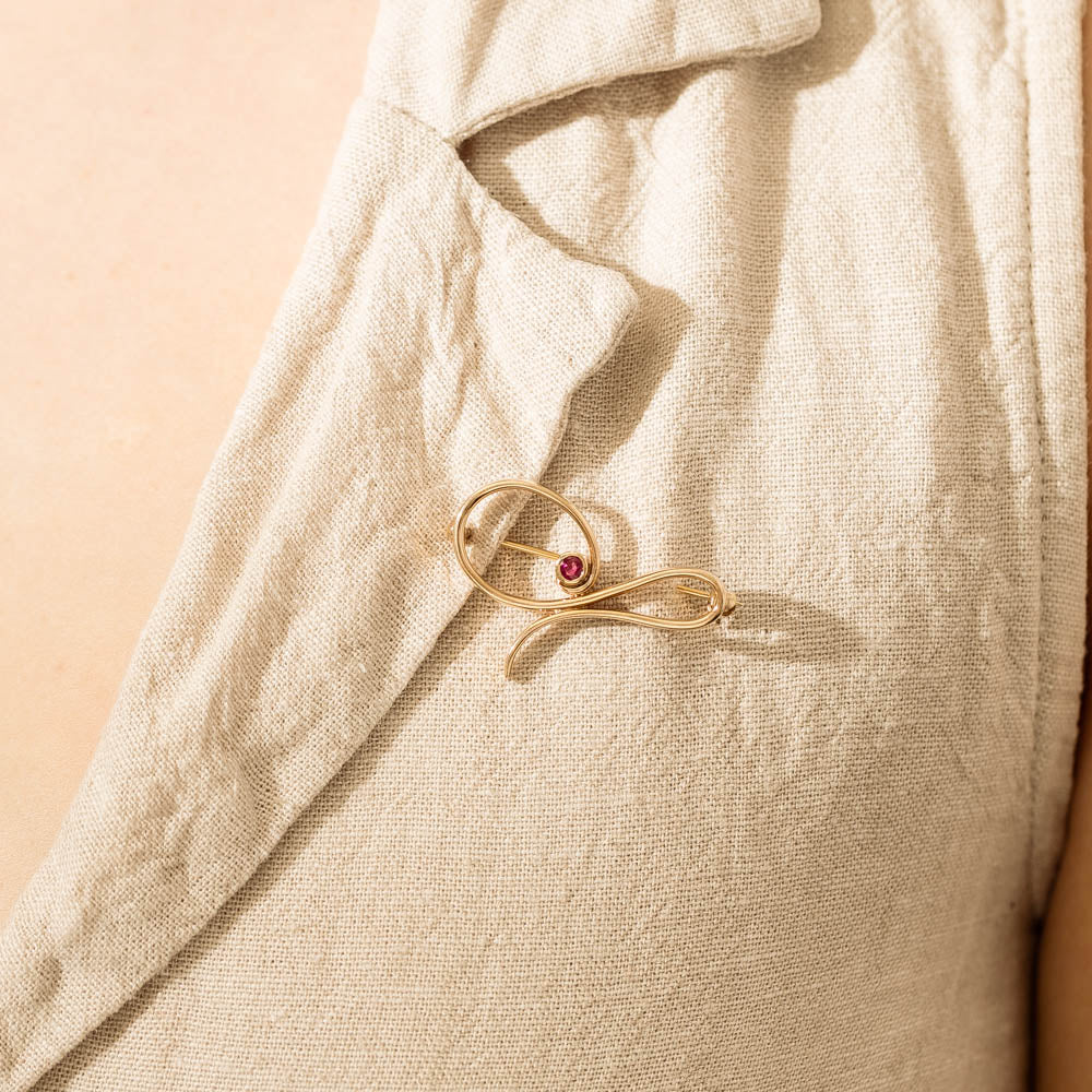 This beautiful 1980s Deja Vu brooch is crafted from 9ct yellow gold and set with a synthetic ruby. Don't miss out on this special piece.