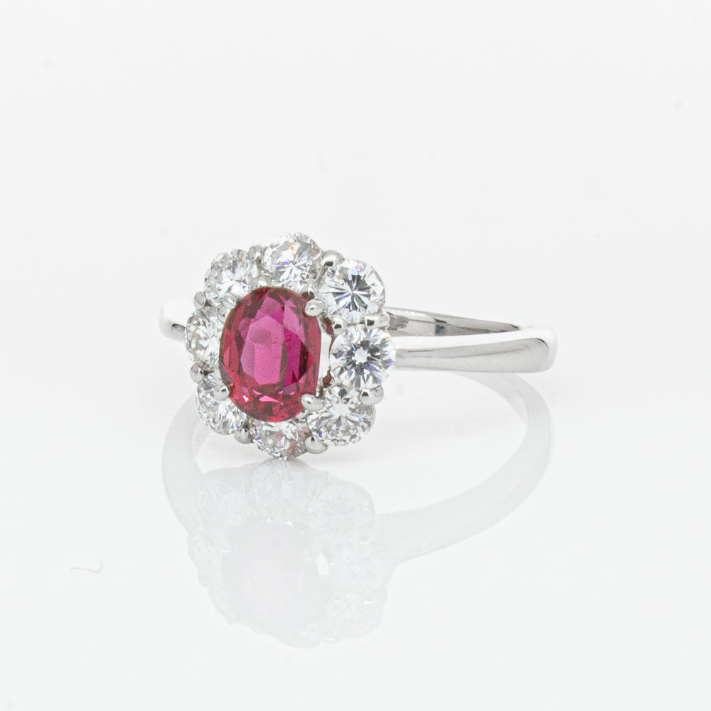 Light up your world as you open the box on this beauty! A wonderful gift idea for a July-born, this mesmerising ring features an exceptional 1.10ct oval faceted ruby from Thailand framed by a decorative eight diamond halo. You will adore showing off this spectacular ring to all your loved ones.