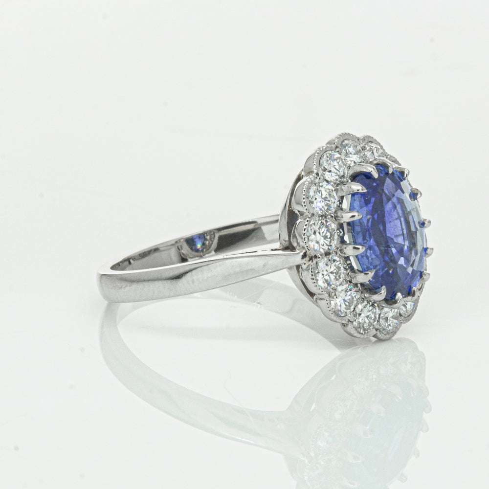 Presenting an extraordinary piece, the Deja Vu Platinum ring displays a stunning oval faceted sapphire at its center, embellished by a halo of fourteen round brilliant cut diamonds. An unforgettable choice for any occasion, this ring is guaranteed to attract attention.