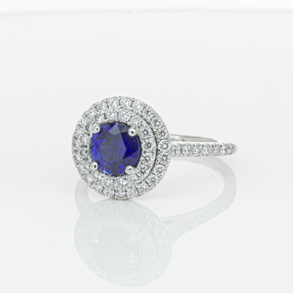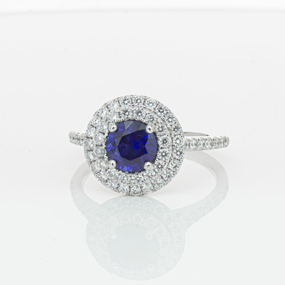 This exquisite ring is expertly made from platinum and showcases a deep blue round-faceted sapphire. Its double diamond halo head and diamond shoulders give off a brilliantly luxurious allure.