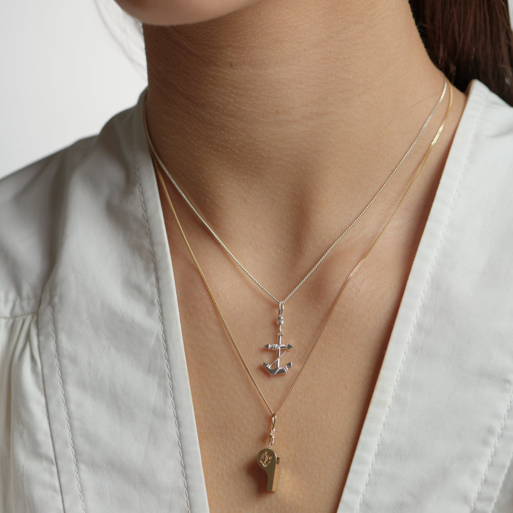 The elegantly be-roped anchor is suspended from a sailing knot bail on an adjustable fine curb chain.
