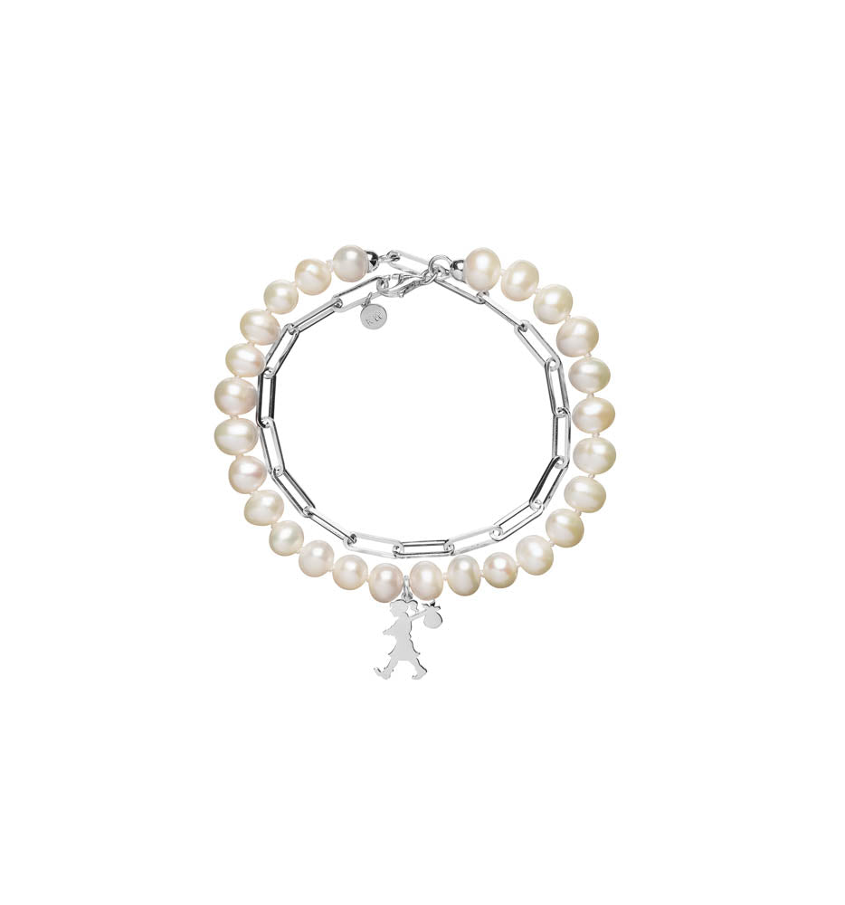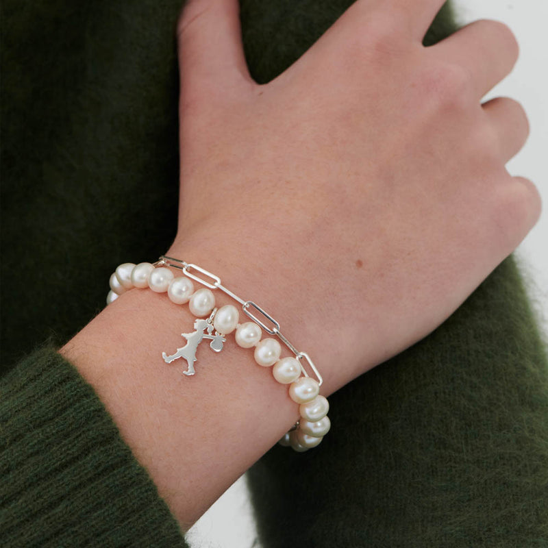 Combining timeless elegance with a fearless and intrepid spirit, a sterling silver Runaway Girl is suspended from a lustrous strand of white freshwater pearls, finished off with a rectangular linked chain, to create a bracelet exuding independence and sophistication.