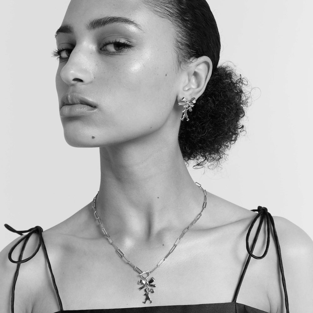 Model wearing Karen Walker Super Love Bow necklace and earrings