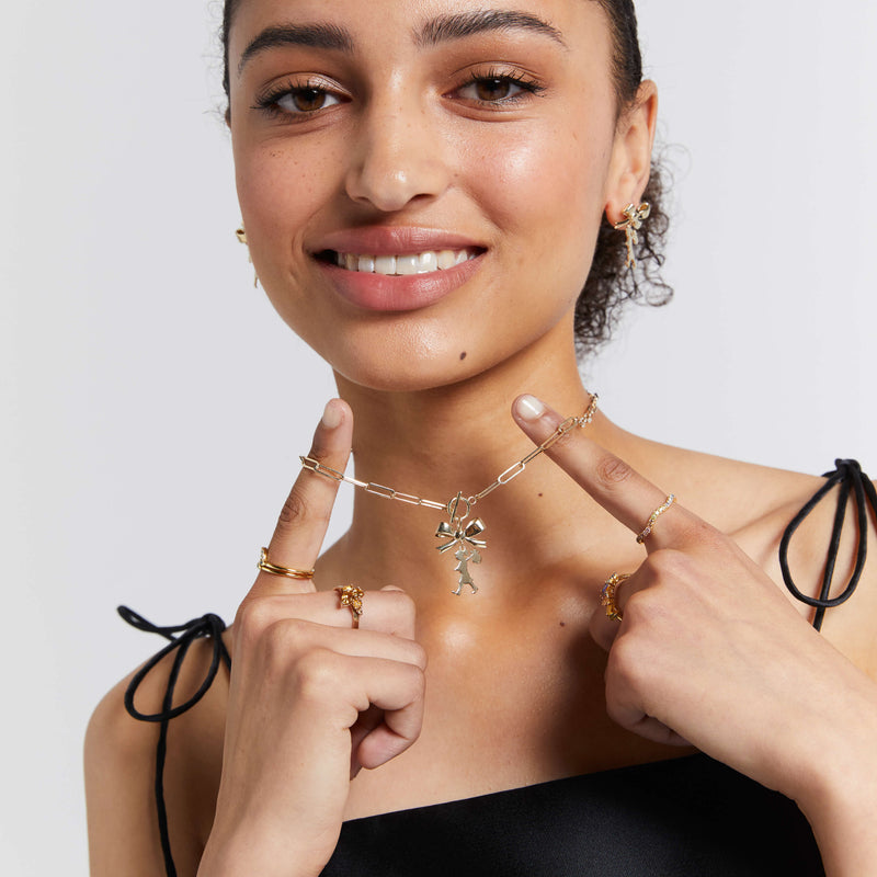 Model wearing Karen Walker Super Love Bow necklace and earrings