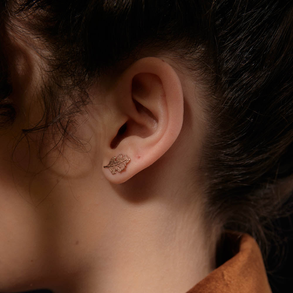 Karen Walker has collected a diminutive duo of oak leaves from the forest floor and cast their intricate form in 9 carat yellow gold to create a dainty pair of stud earrings.