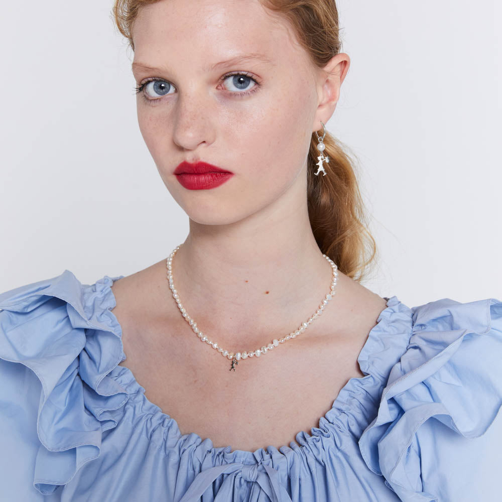 With her fearless and intrepid spirit, Karen Walker's iconic Runaway Girl is suspended in miniature from a lustrous strand of delightfully dainty freshwater pearls for this elegant pearl and sterling silver necklace.
