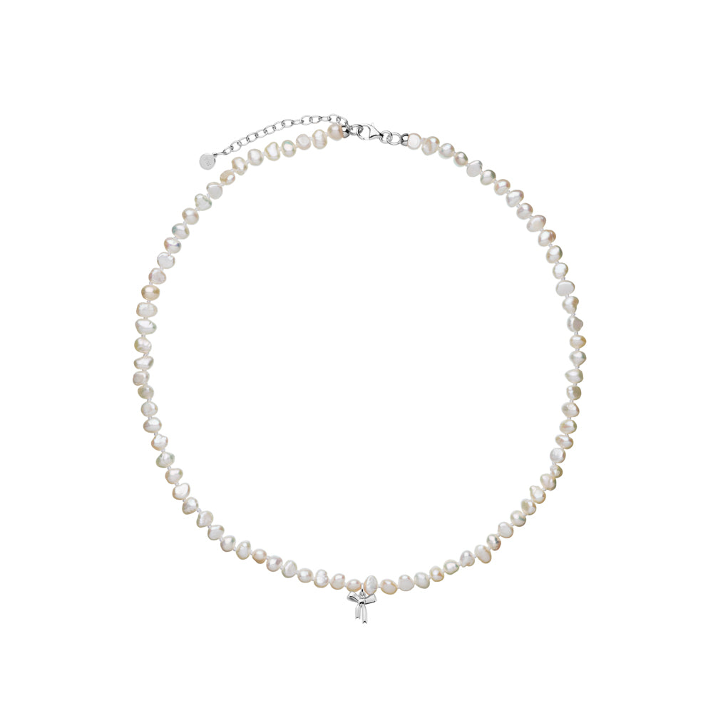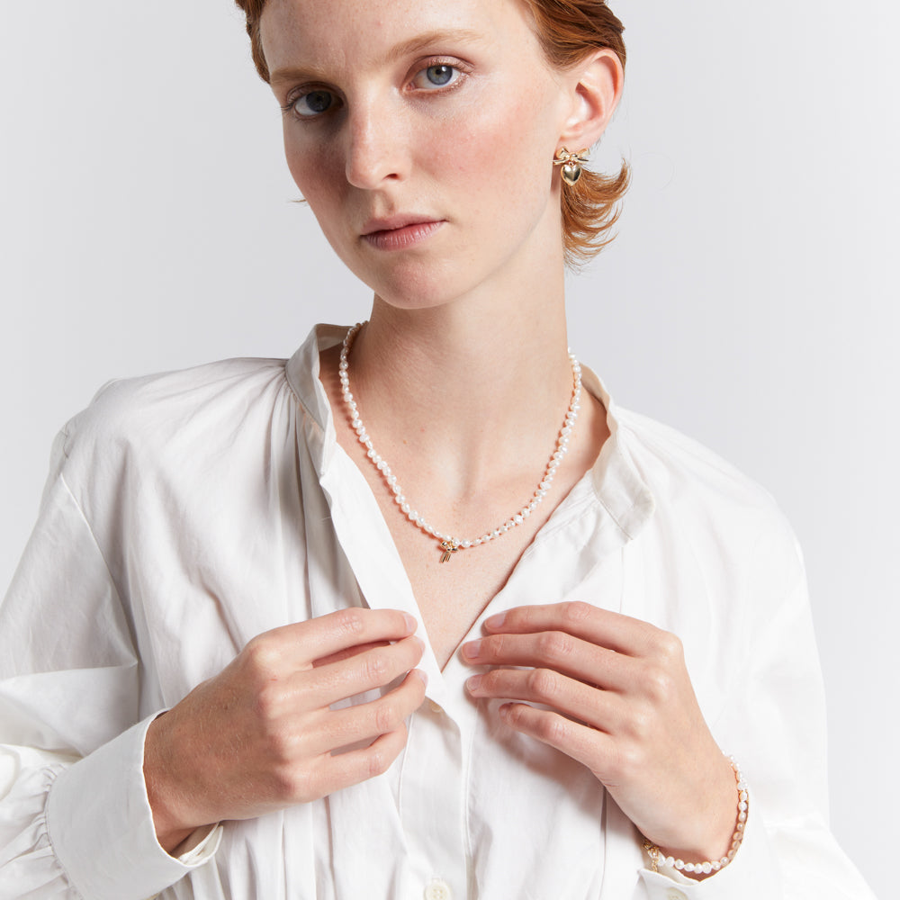 The Petite Bow with Pearls Necklace by Karen Walker features a petite bow hanging gracefully from freshwater pearls, embodying delicate feminity and a nod to Victoriana, and yet with a subtle stylistic pivot, it effortlessly transforms into something masculine, gutsy, and modern.
